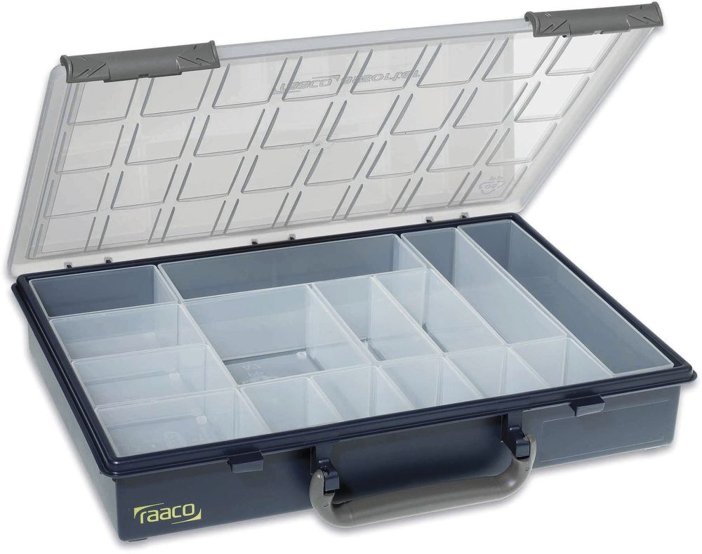 Assortment box with adjustable inner divider through the use of inserts CARRY-LITE 55 series, with ergonomic handle, 15 small compartments, dimensions 340 x 260 x 57 mm