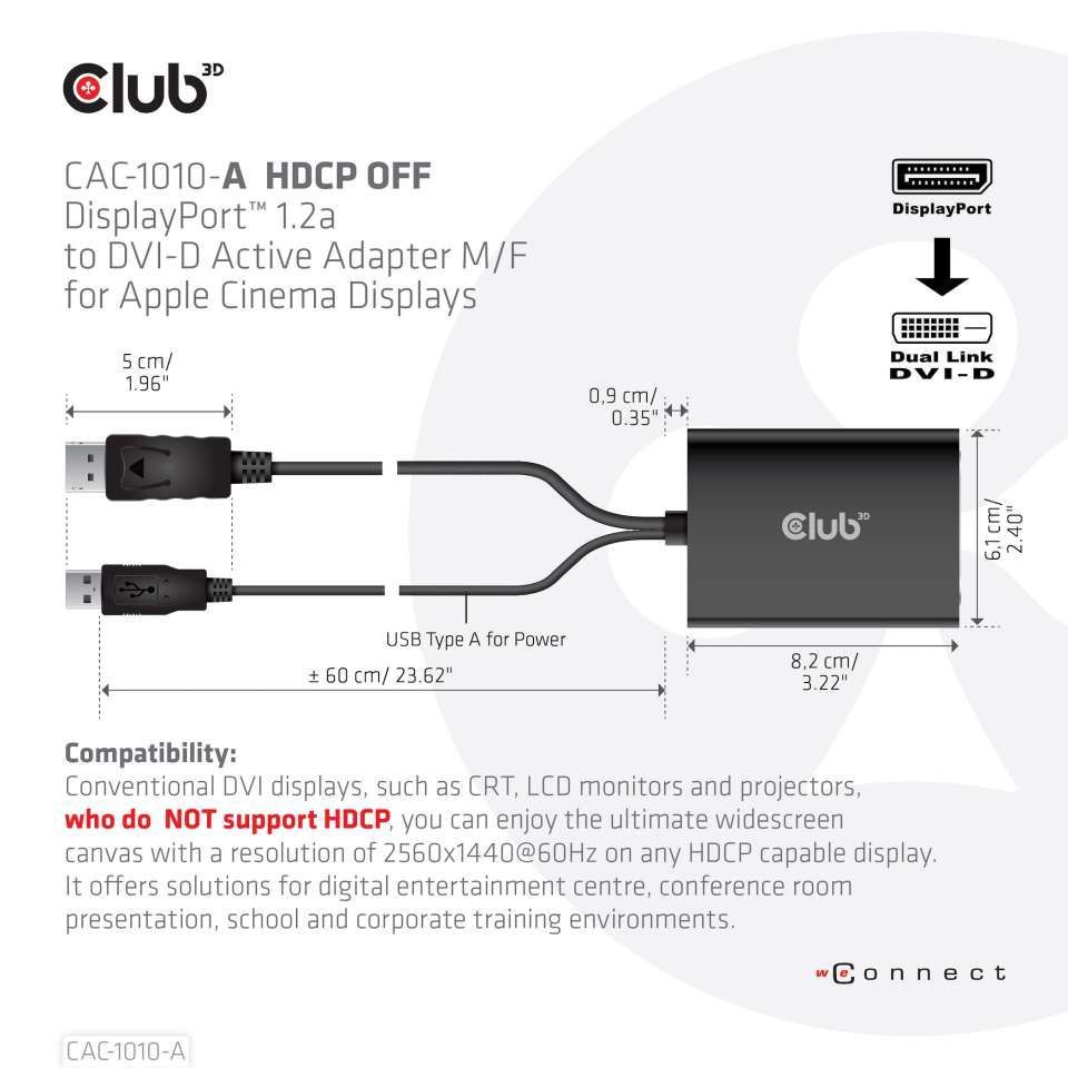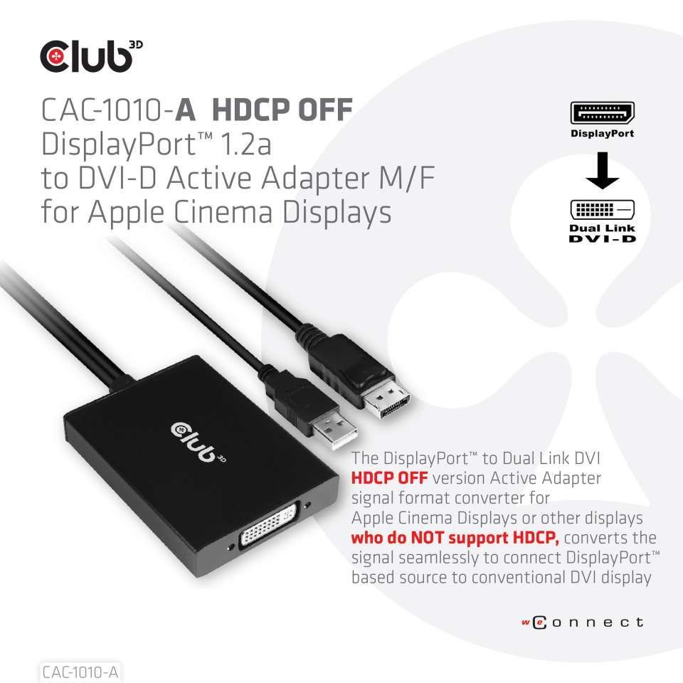We offer you Club 3d CAC-1010-A Adapter DisplayPort => DVI-I *Club3D* Dual Link active for Apple Cinema Displays always at the best possible price. We can give you a discount of 2% on Club 3d CAC-1010-A Adapter DisplayPort => DVI-I *Club3D* Dual Link active for Apple Cinema Displays if you choose payment in advance on ordering.