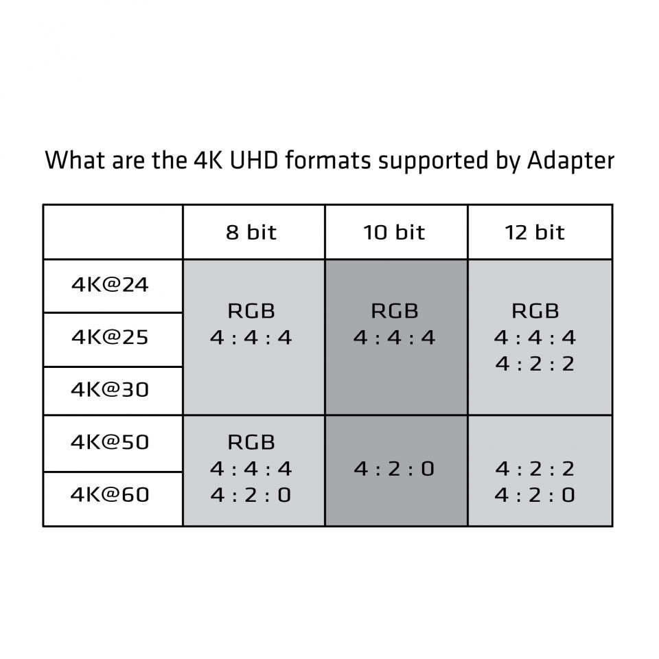 - RGB 8/10/12 bpc YCbCr4:4:4, YCbCr4:2:2, YCbCr4:2:0 8/10/12 bpc