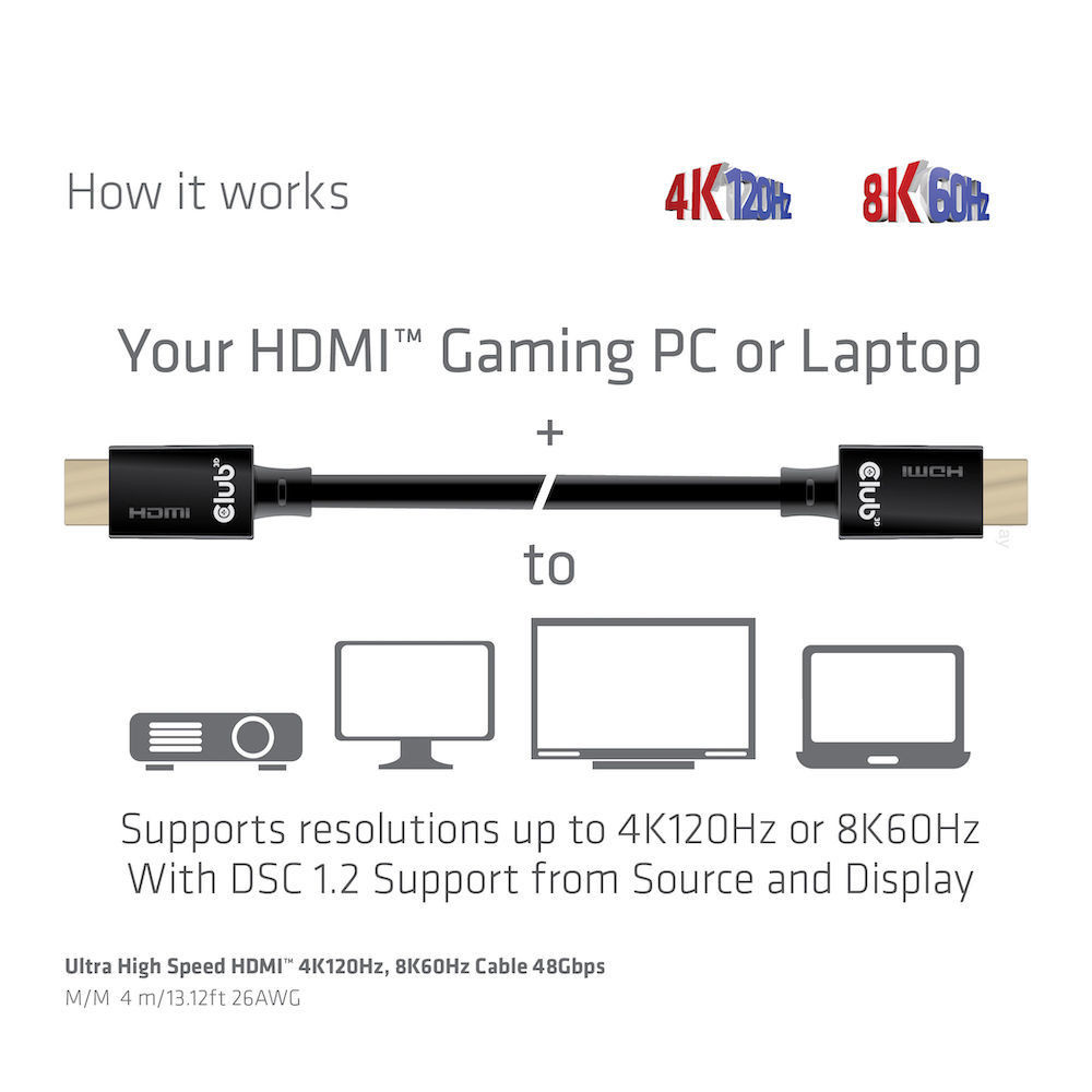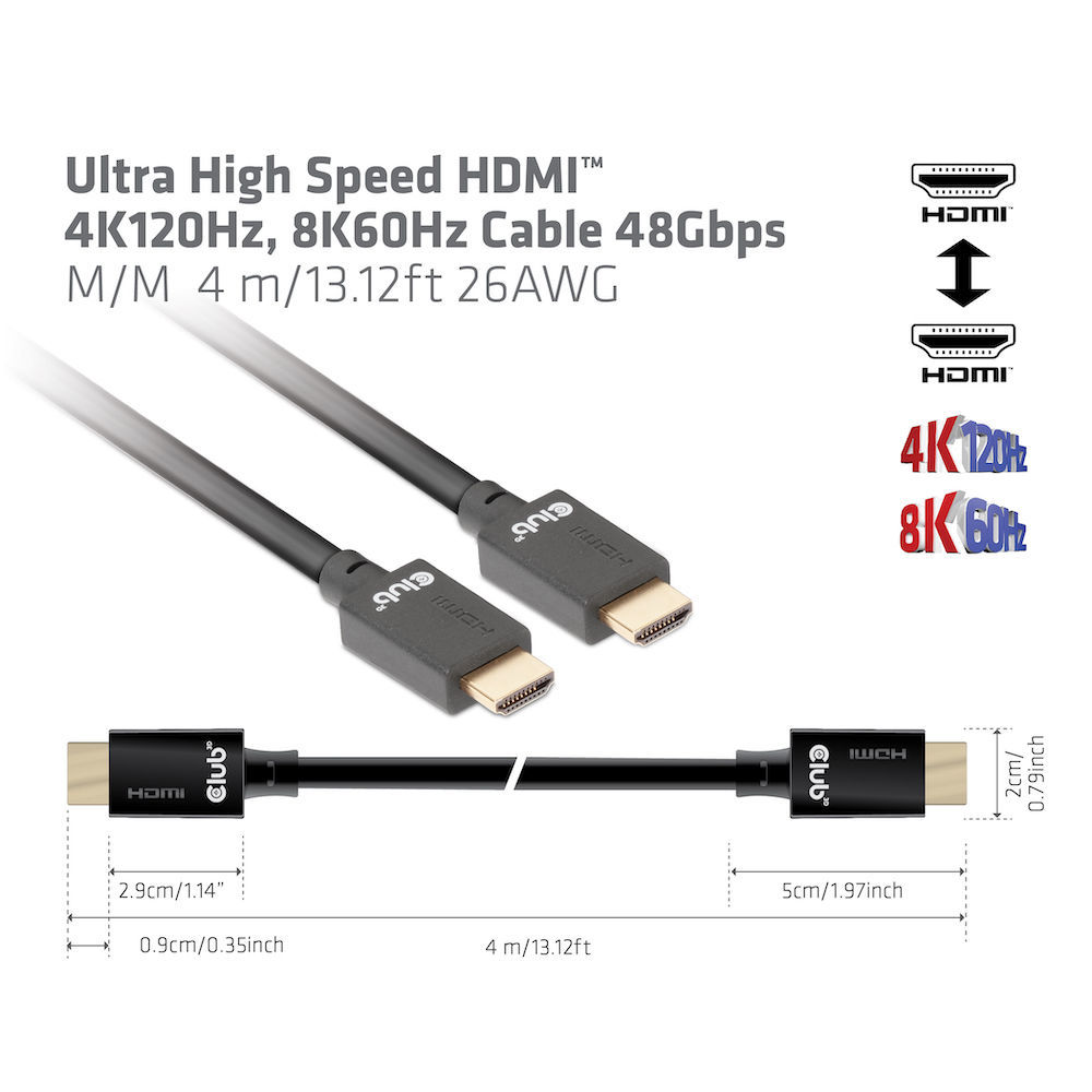 Cable Video HDMI 2.1 Ultra High Speed 4K120Hz 8K60Hz 48Gbps ST/ST 4.0m *Club3D* 26AWG
