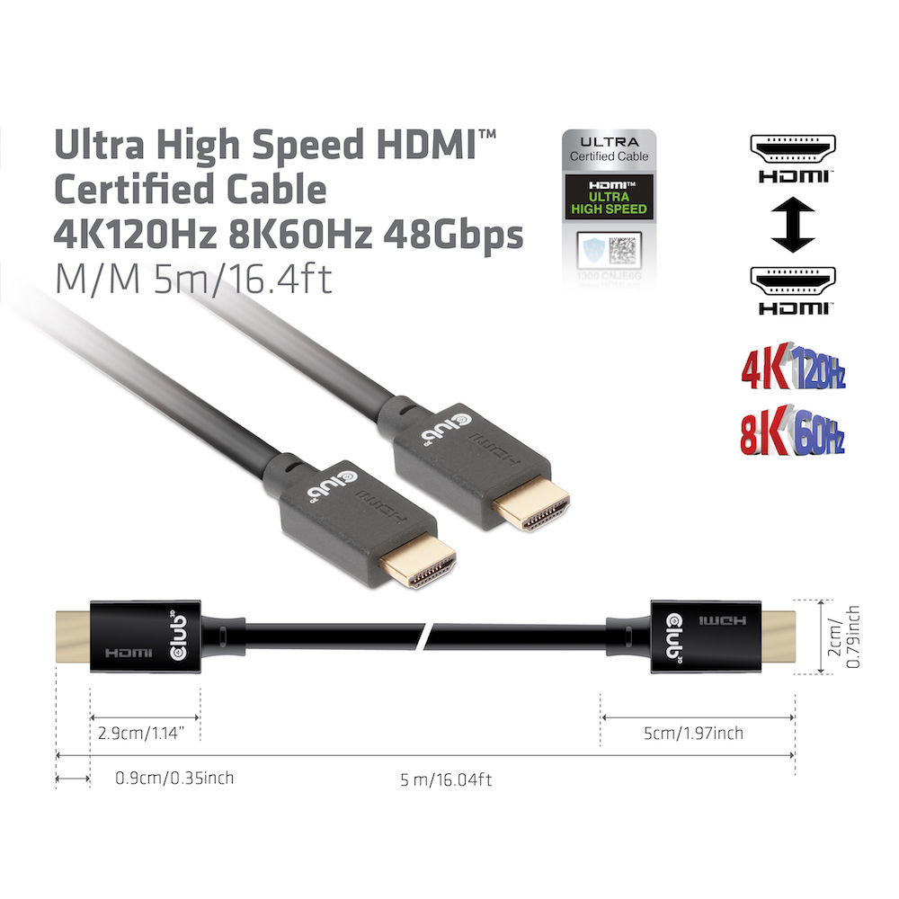 Cable Video HDMI 2.1 Ultra High Speed 4K120Hz 8K60Hz 48Gbps ST/ST 5.0m *Club3D* 26AWG
