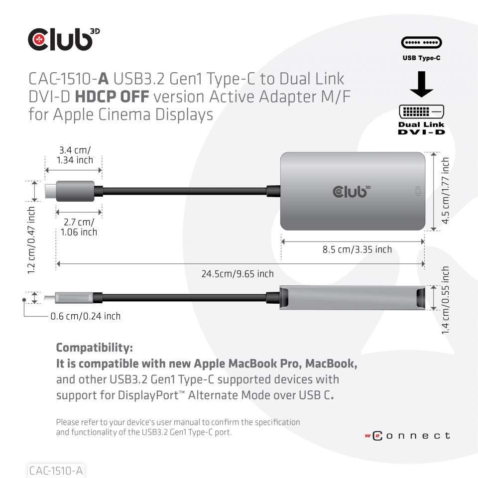 We offer you Club 3d CAC-1510-A Adapter USB-C 3.2 => DVI-D *Club3D* Dual Link active HDCP OFF version always at the best possible price. We can give you a discount of 2% on Club 3d CAC-1510-A Adapter USB-C 3.2 => DVI-D *Club3D* Dual Link active HDCP OFF version if you choose payment in advance on ordering.
