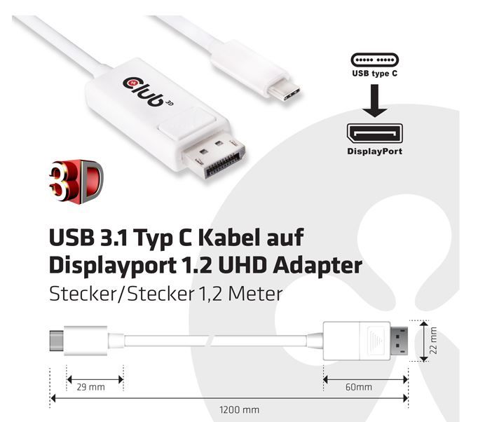 Cable USB 3.1 Type C => DisplayPort 1.2 UHD 1.2m *Club3D*