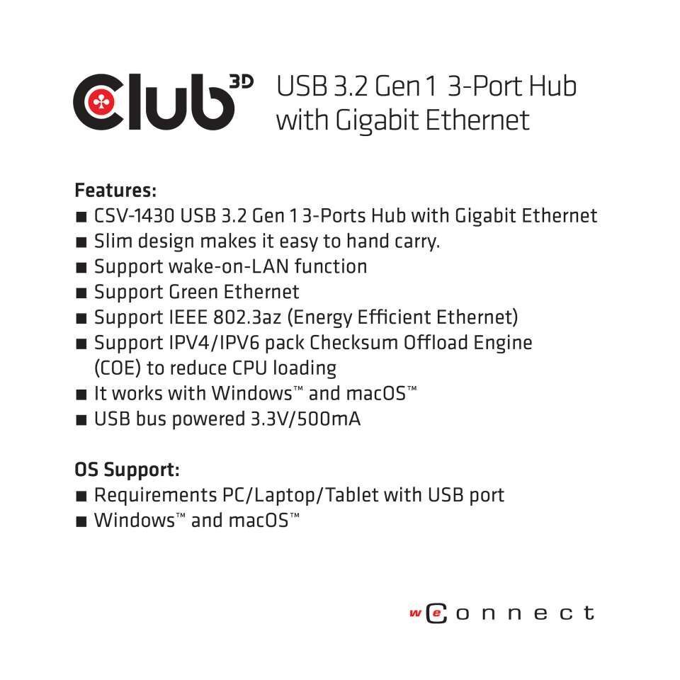 We offer you USB Hub 3.0 - 3-Port Hub with Gigabit Ethernet *Club 3D* always at the best possible price. We can give you a discount of 2% on USB Hub 3.0 - 3-Port Hub with Gigabit Ethernet *Club 3D* if you choose payment in advance on ordering.