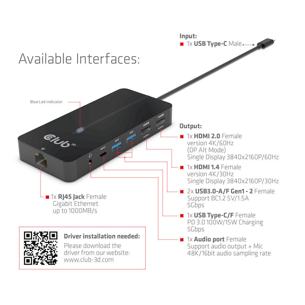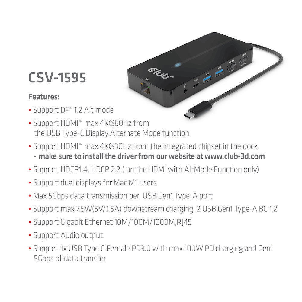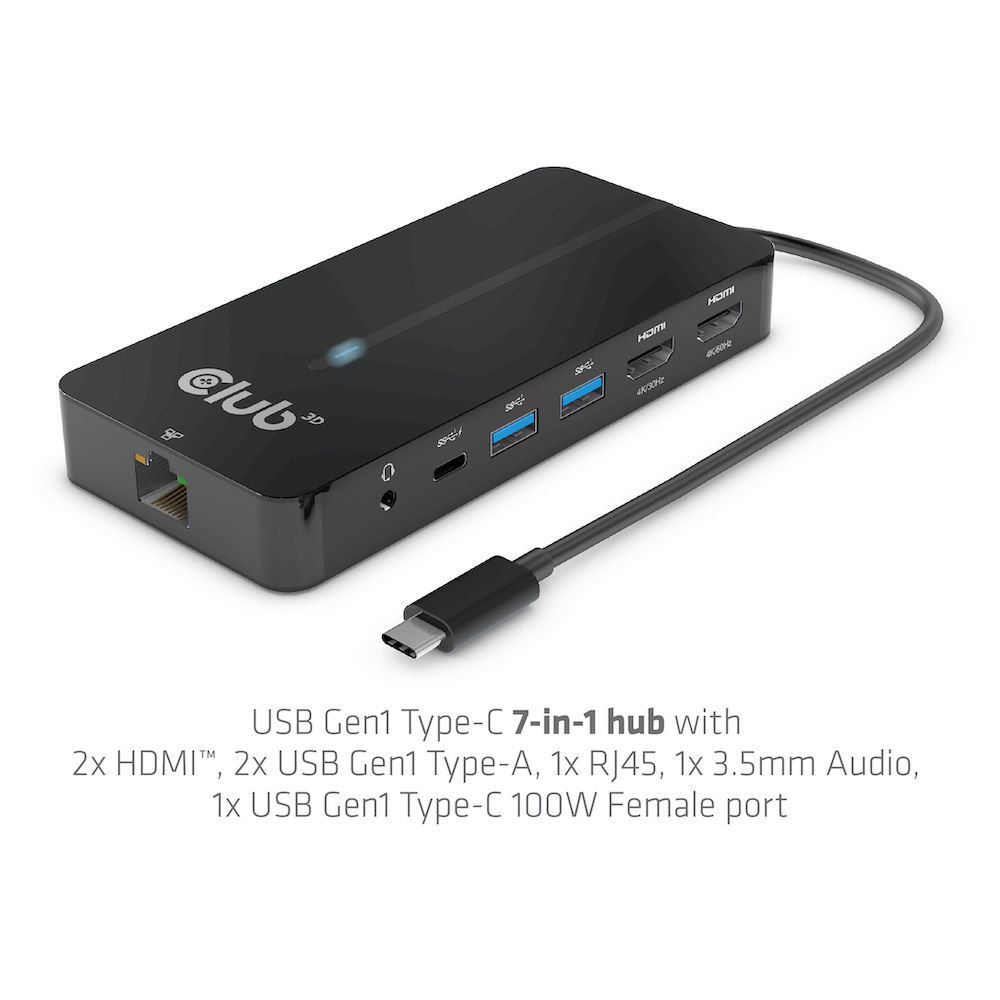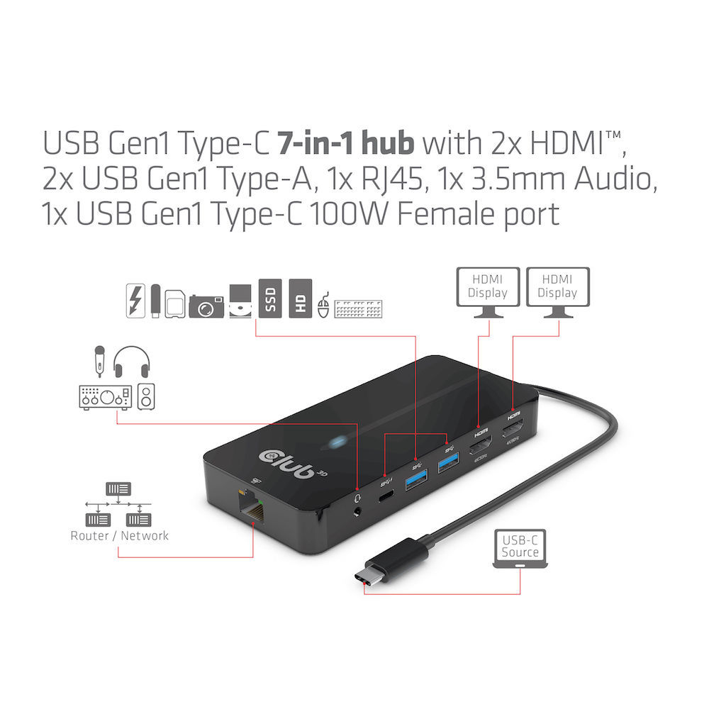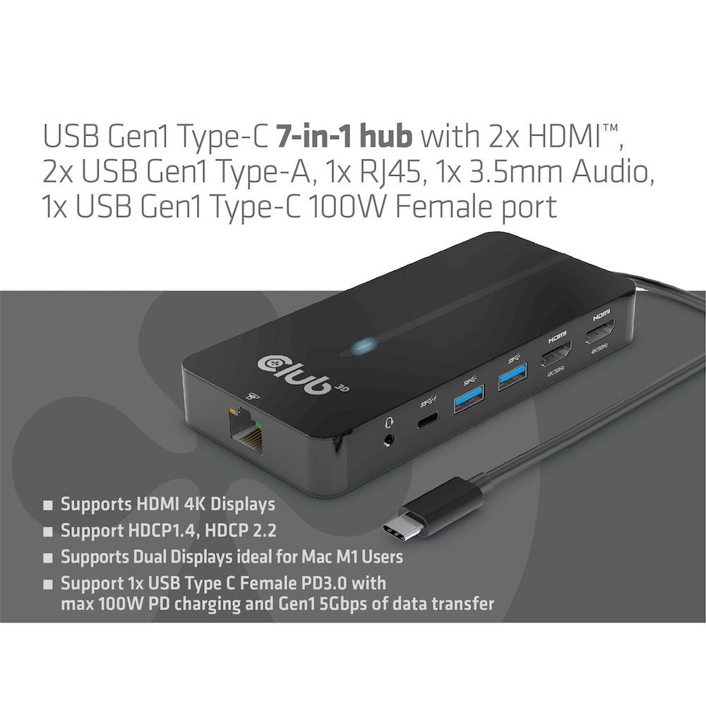 USB Hub Type C => 2x HDMI, 2x USB Gen1 Type-A, 1x RJ45, 1x 3.5mm Audio, 1x USB Gen1 Type-C 100W socket *Club 3D*