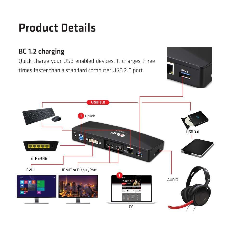 - Outputs: 3x USB 3.0 with 1x BC 1.2 charging socket, 1x HDMI or Displayport socket, 1x DVI socket, 1x Ethernet socket, 1x 3.5mm Audio 2.1 Ch socket, 1x 3.5mm Mic socket