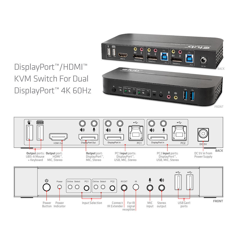 - Supports a DisplayPort or HDMI display and a keyboard and mouse set to control two PCs with DisplayPort connections