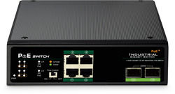 - Industrial 4-port Gigabit PoE+ switch with 2 x SFP uplinks