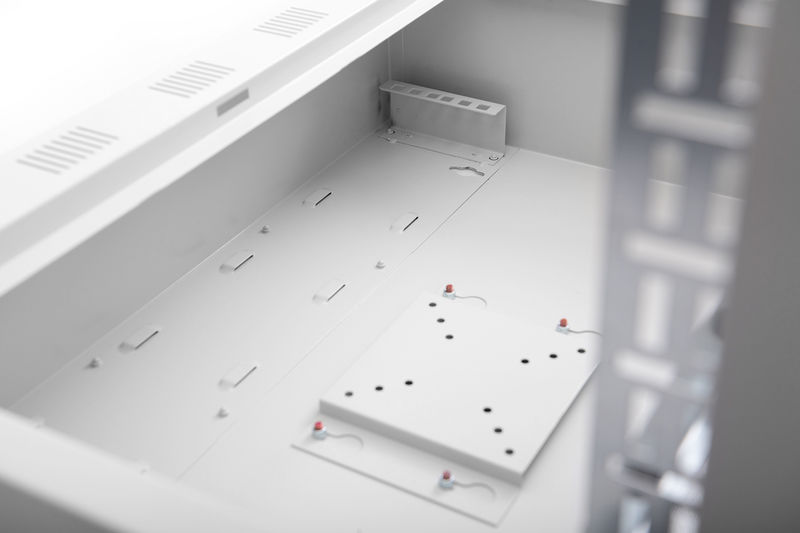 - 2 height units in the upper part of the housing, e.g. for one Socket strip, there is a mounting plate in the door with several fastening options and an additional height unit