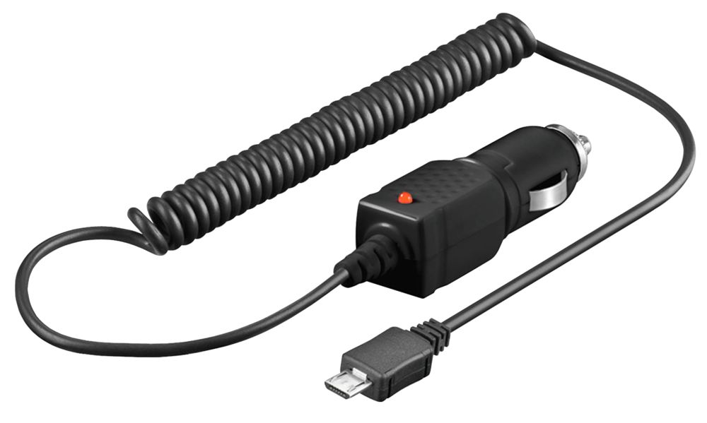 Car cell phone charger for devices with a micro USB port, 1,000mA, 1.5m flexible spiral cable, black