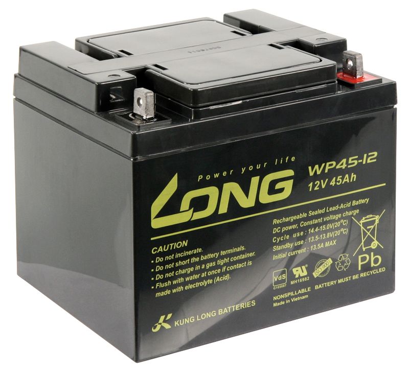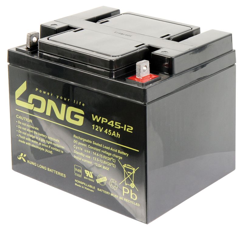 We offer you Lead battery KUNG LONG ''WP45-30,5 cm ( 12 inch ) 12V/45Ah, VdS, 198x166x171mm, 14.1kg always at the best possible price. We can give you a discount of 2% on Lead battery KUNG LONG ''WP45-30,5 cm ( 12 inch ) 12V/45Ah, VdS, 198x166x171mm, 14.1kg if you choose payment in advance on ordering.