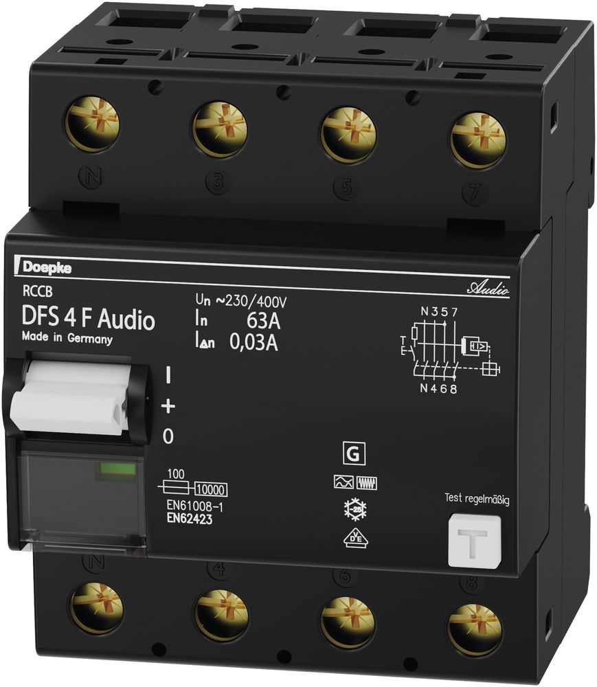 Residual current circuit breakers (RCCB) switch off the power supply when dangerously high residual currents occur. They thus protect people, animals and systems. DFS 4 are two- or four-pole residual current circuit breakers for single- or three-phase networks. In the standard version, the compact devices are four division units wide. They are available with many different residual current types and versions with rated currents of up to 125 A. The large double-deck terminals can also accommodate large conductor cross-sections. The tripped position of the multi-function switch toggle makes troubleshooting easier. The free label software helps with labeling. Type F switches are mixed frequency sensitive. They protect against pulse and alternating residual currents as well as residual currents with mixed frequencies deviating from 50 Hz, regardless of the mains voltage. They are resistant to increased surge currents and storms. Residual current circuit breakers in the audio version ensure uninterrupted sound quality of connected high-quality audio systems. They have a particularly low impedance design and thus enable unrestricted current flow. Properties: sensitive to alternating and pulsating direct fault currents of the mains frequency (type A) as well as alternating fault currents with mixed frequencies other than 50 Hz, high immunity to surge fault currents and mains voltage-driven follow-on current pulses, particularly suitable for protecting high-quality audio components, structural optimization with regard to sound quality, e.g. silver-plated, internal current conductors, silver-plated connection terminals, etc., small size for all rated currents, high short-circuit strength, double-sided double-deck terminals for large conductor cross-sections and rail connection, switch position indicator, viewing window for labeling labels, multi-function switch toggle with three positions: 'on', 'off', 'triggered', connection C1 neutral conductor position on the left, mounting type: quick attachment to mounting rail, installation position can be changed, feed direction can be changed, areas of application: the DFS-Audio is particularly used in circuits with high-quality, audiophile components such as, for example, amplifiers, stereo systems, etc. B. record players, CD players, network streamers, amplifiers, active loudspeakers or even sound systems for theaters, cinemas, etc. A type F residual current circuit breaker ensures high system availability through insensitivity to transient surge currents and reliable detection of alternating and pulsed residual currents of the rated frequency (50 Hz), even if other frequency components are present in the residual current, such as can occur with today's audio devices with transformer or switching power supplies. Notes: Also available as a 60 Hz variant.