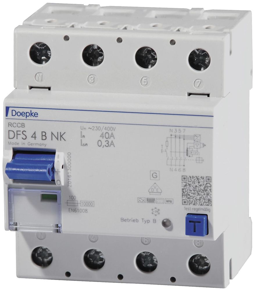 Residual current circuit breakers (RCCBs) are components for implementing the protective measure 'protection by automatic shutdown of the power supply' in accordance with the requirements of VDE 0100 Part 410 or corresponding international installation regulations. Devices in the DFS 4 series are compact two- or four-pole residual current circuit breakers. In the standard version, they only take up four division units. While the DFS 4 version for alternating and pulsating direct residual currents is designed for three-phase networks, but can also be used in single-phase networks, there are special versions for single- or three-phase operation in the universal current sensitive versions (type B, type B+). Despite the compact dimensions, a large number of different tripping currents and characteristics are available for rated currents - depending on the version - up to 125 A. All devices are available in the 'HD' version, which is particularly suitable for use in harsh environments (tunnels, swimming pools, etc.). They also have large double-deck terminals for accommodating large conductor cross-sections, a practical multi-function switch toggle and can be labeled with pre-made labels using free software. DFS 2 and DFS 4 with residual current characteristic B detect smooth DC residual currents as well as all other residual currents of type B in accordance with IEC 60755. The operating voltage required for this is taken from the mains voltage. Correct voltage supply is guaranteed if the voltage between the mains conductors is ? 50 V. Type A residual currents are detected regardless of the mains voltage. Furthermore, these residual current circuit breakers detect residual currents of all frequencies up to 100 kHz without gaps. With this large frequency range of residual current detection, they significantly exceed the requirements of the construction standards for type B residual current circuit breakers. Fault protection in accordance with VDE 0100 Part 410 is provided over the entire frequency range of residual current detection with an appropriate earth resistance. The maximum permissible earthing resistance is calculated as the quotient of the permissible contact voltage and the highest tripping fault current in the entire recorded frequency range. For residual current circuit breakers with the NK characteristic, the tripping frequency response is below the human tolerance limit for damage caused by body currents at different frequencies. For RCCBs with a rated residual current of 30 mA, this means that extensive personal protection is achieved even with fault currents above the rated frequency. With an upper tripping threshold of 300 mA at frequencies up to 100 kHz, significantly more sensitive and far-reaching protection against fire-hazardous earth fault currents is provided compared to the B SK or B+ characteristics. This means that comprehensive fire protection is also possible for electronic equipment with high clock frequencies.The high level of protection provided by the NK characteristic requires the system to be monitored to be designed with low leakage current. Standard devices are designed to monitor circuits with a rated voltage of 230 V or 400 V and a rated frequency of 50 Hz. Properties: - meets the requirements of the building regulations VDE 0664-10, VDE 0664-40, VDE 0664-400, ÖVE/ÖNORM E 8601, - universally sensitive for fault currents with frequencies and mixed frequencies from 0 Hz (smooth direct current) to 100 kHz, - electromagnetic compatibility in accordance with VDE 0664-30 and VDE 0839-6-2 (interference immunity for industrial applications), - high availability, including voltage-dependent detection of smooth direct fault currents and alternating fault currents with frequencies ? 50/60 Hz through full functionality with mains voltages from at least 50 V AC on any two active conductors, - mains voltage-independent tripping in the event of fault currents of type A, - small size for all rated currents, - high short-circuit