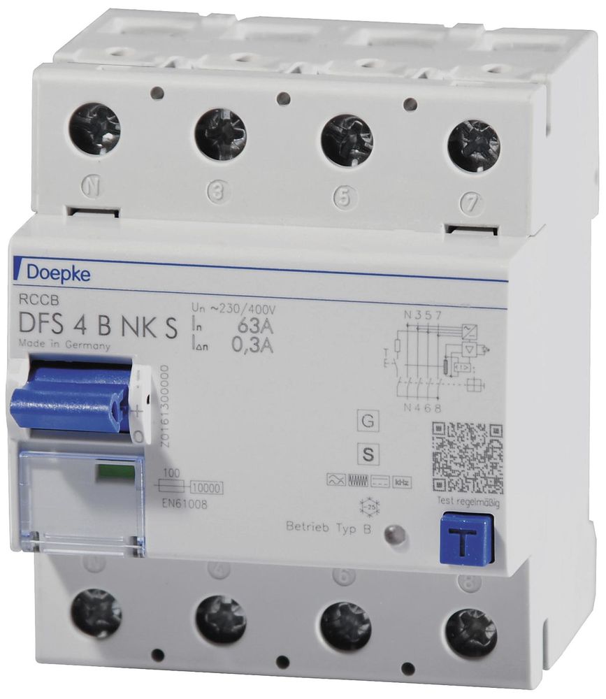 Residual current circuit breakers (RCCBs) are components for implementing the protective measure of protection by automatically switching off the power supply in accordance with the requirements of VDE 0100 Part 410 or corresponding international installation regulations. Devices in the DFS 4 series are compact two- or four-pole residual current circuit breakers. In the standard version, they only take up four division units. While the DFS 4 version for alternating and pulsating direct residual currents is designed for three-phase networks, but can also be used in single-phase networks, there are special versions for single- or three-phase operation in the universal current sensitive versions (type B, type B+). Despite the compact dimensions, a large number of different tripping currents and characteristics are available for rated currents - depending on the version - up to 125 A. All devices are available in the HD version, which is particularly suitable for use in harsh environments (tunnels, swimming pools, etc.). They also have large double-deck terminals for accommodating large conductor cross-sections, a practical multi-function switch toggle and can be labeled with pre-made labels using free software. DFS 2 and DFS 4 with residual current characteristic B detect smooth DC residual currents as well as all other residual currents of type B in accordance with IEC 60755. The operating voltage required for this is taken from the mains voltage. Correct voltage supply is guaranteed if the voltage between the mains conductors is ? 50 V. Type A residual currents are detected regardless of the mains voltage. Furthermore, these residual current circuit breakers detect residual currents of all frequencies up to 100 kHz without gaps. With this large frequency range of residual current detection, they significantly exceed the requirements of the construction standards for type B residual current circuit breakers. Fault protection in accordance with VDE 0100 Part 410 is provided over the entire frequency range of residual current detection with an appropriate earth resistance. The maximum permissible earthing resistance is calculated as the quotient of the permissible contact voltage and the highest tripping fault current in the entire recorded frequency range. For residual current circuit breakers with the NK characteristic, the tripping frequency response is below the human tolerance limit for damage caused by body currents at different frequencies. For RCCBs with a rated residual current of 30 mA, this means that extensive personal protection is achieved even with fault currents above the rated frequency. With an upper tripping threshold of 300 mA at frequencies up to 100 kHz, significantly more sensitive and far-reaching protection against fire-hazardous earth fault currents is provided compared to the B SK or B+ characteristics. This means that comprehensive fire protection is also possible for electronic equipment with high clock frequencies.The high level of protection provided by the NK characteristic requires the system to be monitored to be designed with low leakage current. Selective residual current circuit breakers require a longer flow time of the fault current to be triggered than instantaneous switches. This enables selective shutdown in systems with staggered distributions, ie with series-connected RCCBs, in the event of a fault only the RCCB in whose immediately downstream system section the earth fault occurs will trip. Due to their long shutdown times and high rated residual currents, selective residual current circuit breakers only provide fire protection and fault protection (protection against indirect contact). Additional protection (protection against direct contact, personal protection) is therefore not possible.Standard devices are designed for monitoring circuits with a rated voltage of 230 V or 400 V and a rated frequency of 50 Hz.Features: selective to all undelayed RCCBs (type AC, A or B) for residual currents of all frequencies in the detection range