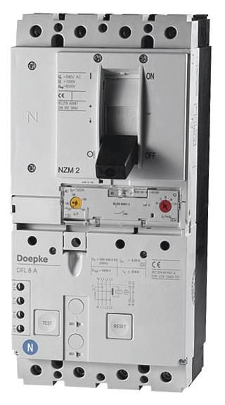 Circuit breakers with residual current protection (CBR) switch high currents, protect equipment, cables and lines from overcurrent and people from electric shock. DFL 8 are compact devices with an integrated auxiliary switch and connection terminals for large cable cross-sections. Type A switches are sensitive to pulse and alternating current. This function is independent of the mains voltage. Switches of this variant have a fixed rated residual current of 30 mA for personal protection. They therefore ensure fault and fire protection as well as additional protection (personal protection, protection against direct contact). Devices in the standard version are designed for monitoring circuits with a rated voltage of 400 V/690 V and a rated frequency of 50 Hz. Properties: fixed rated residual current of 0.03 A, rated currents from 100 A to 250 A, four-pole, rated voltage 400 / 690 V AC, residual current detection for alternating and pulsating direct residual currents, functional range of the residual current tripping 0 - 690 V, functional range of the residual current test device 280 - 690 V, mains and auxiliary voltage independent tripping in the event of overcurrent and residual current, high short-circuit switching capacity, connection terminals up to 185 mm2, high surge current strength, i.e. low tendency to false tripping due to transient fault currents, thresholds for instantaneous and delayed overcurrent tripping adjustable, auxiliary switch integrated, type of installation: attachment to mounting plate, installation position optional, feed direction optional, areas of application: power supplies in purpose-built buildings and industrial plants with TN-S, TT and TN-CS networks with high short-circuit power, in IT networks The residual current tripping of the CBR can be provided for shutdown in the event of a second earth fault. The use for residual current protection in TN-C networks is excluded. Note: In systems whose electronic equipment can cause smooth DC residual currents or residual currents with frequencies other than 50 Hz, the CBR Type A does not provide comprehensive protection. For such applications, we recommend our universal current sensitive CBR Type B.