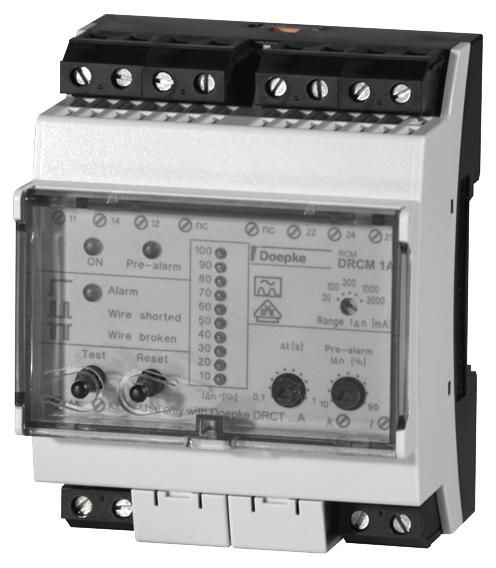 RCM ('Residual Current Monitors') in combination with separate residual current transformers enable monitoring of the insulation between active conductors and earth. In contrast to modular residual current devices (MRCD) or residual current circuit breakers (RCCB), they are used where switching off the system is not possible or not desired. They are therefore only used to monitor or report residual currents and are therefore suitable for preventive maintenance. They are not suitable for implementing the protective measure 'protection by automatic shutdown of the power supply' in accordance with DIN VDE 0100-410. Residual current monitors of the DRCM series are characterized by a large number of usable total current transformers - and thus also conductor cross-sections or rated currents. The bar display shows the current residual current. The alarm is reported when a defined response threshold is reached. The level of the current residual current and the exceedance of the response thresholds can be read on a 10-fold LED display on the front of the device. A faulty connection to the external residual current transformer is immediately indicated by a flashing code of the alarm LED and activation of the signaling contacts. The adjustable response delay in the range of 0.1 s to 1 s (in steps of 100 ms) makes it possible to avoid a response to short-term residual current pulses, e.g. as a result of lightning strikes and switching overvoltages. This also makes it possible to achieve selectivity of devices connected in series, which makes fault localization easier. Two independent, potential-free changeover contacts offer the option of forwarding the alarm to optional signaling panels, signaling lights, acoustic signaling devices, touch panels, PLCs, etc. Monitors with the residual current characteristic A detect sinusoidal alternating and pulsating direct residual currents. Standard devices are designed for monitoring circuits with a rated voltage of 230 V or 400 V and a rated frequency of 50 Hz. Properties: - VDE-certified (DIN EN 62020), - suitable for detecting residual currents of the residual current characteristic type A, - monitored frequency range 50 - 60 Hz, - nominal response residual current adjustable in five stages (30, 100, 300, 1000 and 3000 mA), - residual current transformers with inner diameters of 20, 30, 35, 70, 105, 140 and 210 mm available, - rated voltage of the monitored circuit up to 690 V, - fixed response threshold of the alarm between 75 % and 100 % of the set nominal response residual current (I?n), - adjustable pre-alarm threshold, - alarm relay with two potential-free changeover contacts (230 V AC / 5 A), - selectivity adjustable in ten stages (0.1 s to 1 s in steps of 100 ms), - auxiliary voltage dependent, - compact,Robust plastic housing, - easy installation, Installation type: - quick fastening on mounting rail, - installation position as desired, Areas of application: - The monitoring device is suitable for use in power supplies of functional buildings and industrial plants with TN-S, TN-CS networks and IT networks, e.g. in server rooms of data centers, in laboratories, in the automotive industry and in connection with air conditioning systems, printing machines and packaging machines., - Use in TN-C networks and direct current networks as well as the monitoring of systems in which electronic equipment can cause smooth direct residual currents or residual currents with frequencies other than the rated frequency of the RCCB is excluded., Notes: RCMs are not suitable for the basic protection measure 'protection by automatic shutdown of the power supply' in accordance with DIN VDE 0100-410 (an RCM does not replace an RCD). The residual currents are recorded separately by separately available external residual current devices.