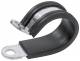Bracket SILVYN® RKS 1 32/15, bracket, for hose outer diameter: 32.0mm, bore diameter: 6.4mm, steel, areas of application: suitable for medium mechanical stress, suitable for outdoor use, for use with SILVYN® protective hoses, universally suitable for guiding and/or bundling cables, protective hoses and pipes, largely resistant to acids and alkalis, benefits: large variety of diameters allows for a wide range of applications, rubber profile made of polychloroprene protects the held products from abrasion, increased protection of the held products through secure guidance and/or bundling along their installation, increased protection of the held products through secure fastening to the housing, even if direct insertion into the housing is not possible, easy installation using a fastening hole Sales unit: 100 pieces Lieske Part No.: 438075