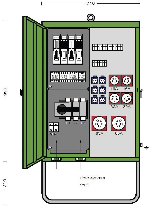 1 FI 63 A, 0.03 A, type B, 2 CEE 5-pin. 32 A, 2 CEE 5-pin. 16 A,