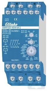 With 4 independent contacts, 1 normally open contact each, potential-free 16A/250V AC, 230V LED lamps up to 600W, incandescent lamps 2000W. Stand-by loss only 0.03-0.4 watts. Modular device for mounting on DIN-EN 60715 TH35 mounting rail. 2 division units = 36mm wide, 58mm deep. With the patented Eltako Duplex technology (DX), 3 of the 4 normally potential-free contacts can still switch at zero crossing when switching 230V AC 50Hz, thus drastically reducing wear. To do this, simply connect the N conductor to the terminal (N) and the outer conductors to 1(L), 3(L) or 5(L). This results in an additional stand-by loss of only 0.1 watts. If the contact is used to control switching devices which do not themselves switch at zero crossing, (N) should not be connected as the additional closing delay would otherwise have the opposite effect. Local universal control voltage 8..230V UC. With additional universal voltage control inputs central on and off for 8..230V UC, galvanically isolated from the local control inputs. With additional group control inputs on and off for 8..230V UC. Same potential as the local control inputs. Groups of these impulse switches can be controlled separately in a central control system via the group control inputs. Supply voltage same as the local control voltage. By using bistable relays, there is no coil power loss and no heating as a result, even when switched on. After installation, wait for the automatic short synchronization before connecting switched consumers to the mains. Central commands always have priority, the local control inputs are blocked during the central command. If the supply voltage fails, the device is switched off in a defined manner. Using the upper rotary switch, this impulse switch can be fully or partially excluded from the central control: ZE+ZA = centrally on and centrally off effective, ZE = only centrally on effective, ZA = only centrally off effective, ZE+ZA = no central control effective. The middle rotary switch is used to preselect the functions of the lower rotary switch for ES and ER. ER is used to select the bracket functions. If BM is selected, it can be controlled with a motion detector; function as per the operating instructions. Not suitable for feedback with the switching voltage of a dimmer switch. Only use the ESR12DDX-UC, ESR12NP-230V+UC or ESR61NP-230V+UC relays for this. The lower rotary switch can be used to choose between 18 functions: ON = permanently ON. 4xS = 4-way impulse switch, each with 1 normally open contact, control inputs A1, A3, A5 and A7. (4xR) = 4-way switching relay with 1 normally open contact each, control inputs A1, A3, A5 and A7. 4S = impulse switch with 4 normally open contacts. (4R) = switching relay with 4 normally open contacts. 2S/WS = impulse switch with 3 normally open contacts and 1 normally closed contact. (2R/WR) = switching relay with 3 normally open contacts and 1 normally closed contact. 2WS = impulse switch with 2 normally open contacts and 2 normally closed contacts.(2WR) = switching relay with 2 normally open contacts and 2 normally closed contacts. SSa = series switch 2 + 2 normally open contacts with switching sequence 0-2-2+4-2+4+6, feedback 8. (4RR) = closed-circuit relay with 4 normally closed contacts. SSb = series switch 2 + 2 normally open contacts with switching sequence 0-2-2+4-2+4+6-2+4+6+8. (EW) = switch-on wiping relay with 3 normally open contacts and 1 normally closed contact, wiping time 1s. GS = group switch. Switching sequence 0-2-0-4-0-6-0, feedback 8. (AW) = switch-off wiping relay with 3 normally open contacts and 1 normally closed contact, wiping time 1s. RS = switch with 4 normally open contacts, A1 = set and A3 = reset control input. (GR) = group relay 1 + 1 + 1 +1 normally open contacts. 3xS+ = 3-way impulse switch with 1 normally open contact each + feedback 8, control inputs A1, A3 and A5. (3xR+) = 3-way switching relay with 1 normally open contact each + feedback 8, control inputs A1, A3 and A5.