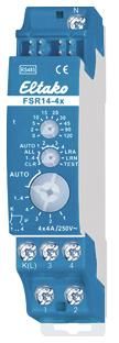 Impulse switching relay with 4 channels, 1 normally open contact 4A/250V AC each, 230V LED lamps up to 200W, incandescent lamps 1000W, electrically isolated from the supply voltage, with DX technology. Bidirectional. Standby loss only 0.1 watts. Modular device for mounting on DIN-EN 60715 TH35 mounting rail. 1 division unit = 18mm wide, 58mm deep. Connection to the Eltako RS485 bus. Cross-wiring of bus and power supply with jumper. With the patented Eltako duplex technology, the normally potential-free contacts can still switch at zero crossing when switching 230V AC 50Hz, thus drastically reducing wear. To do this, simply connect the N conductor to terminal (N) and L to K(L). This results in an additional standby loss of just 0.1 watts. If all 4 relays of the FSR14-4x are switched on, 0.7 watts are required. If the supply voltage fails, the device is switched off in a defined manner. The channels can be taught in independently of one another as ES and/or ER channels. Scene control: Using one of the four control signals from a button with a double rocker that has been taught in as a scene button, several channels of one or more FSR14-4x can be switched on or off for one scene each. Central commands can be sent using radio buttons and/or a Professional Smart Home Controller. The buttons are taught in using the rotary switches and the 4 channels are tested if necessary. For normal operation, the middle and lower rotary switches are then set to AUTO. With the upper rotary switch, the EW time (0-120 seconds) for relays or the RV time (0-120 minutes) for impulse switches can be set the same for all channels if necessary. If wireless motion brightness sensors FBH (master) and/or FBH (slave) are taught-in, the switching threshold at which the lighting switches on or off is set separately for each channel using the upper rotary switch. Settings for the upper rotary switch are as per the operating instructions. If wireless brightness sensors are taught-in, the switching threshold at which the lighting switches on or off depending on the brightness is set separately for each channel using the upper rotary switch (from approx. 0
