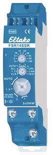 Silent impulse switching relay with 2 channels, 230V LED lamps up to 400W, incandescent lamps 400W. 2 solid-state relays not potential-free. Bidirectional. Standby loss only 0.1 watts. Modular device for mounting on DIN-EN 60715 TH35 mounting rail. 1 division unit = 18mm wide, 58mm deep. Connection to the Eltako RS485 bus. Cross-wiring bus and power supply with jumper. If both relays of the FSR14 are switched on, 0.4W is required. The nominal switching capacity of 400W applies to one contact and also as the sum of both contacts. Parallel connection of several devices to increase performance is permitted. From production week 12/17 with automatic electronic overtemperature shutdown. If the load is < 1W, a GLE must be connected in parallel to the load. If the supply voltage fails, it is switched off in a defined manner. The channels can be taught in independently of one another as ES and/or ER channels. Scene control: With one of the four control signals of a button with a double rocker that has been taught in as a scene button, several channels of one or more FSR14SSRs can be switched on or off for one scene each. Central commands can be sent with radio buttons and/or with a Professional Smart Home Controller. The buttons are taught in with the rotary switches and, if necessary, the 2 channels are tested. For normal operation, the middle and lower rotary switches are then set to AUTO. With the upper rotary switch, the EW time (0-120 seconds) for relays or the RV time (0-120 minutes) for impulse switches is set the same for all channels if necessary. If radio motion brightness sensors FBH (master) and/or FBH (slave) are taught in, the switching threshold at which the lighting switches on or off is set separately for each channel with the upper rotary switch. Settings for the upper rotary switch according to the operating instructions. If wireless brightness sensors are taught-in, the switching threshold at which the lighting switches on or off depending on the brightness is set separately for each channel using the upper rotary switch (from approx. 0