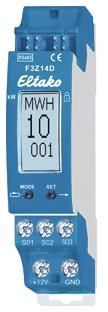 Radio meter collector for electricity, gas and water meters. For 3 S0 interfaces and/or 3 AFZ scanners, standby loss only 0.1 watts. Modular device for mounting on DIN-EN 60715 TH35 rail. 1 division unit = 18mm wide, 58mm deep. Connection to the Eltako RS485 bus. Cross-wiring of bus and power supply with jumper. This meter collector can collect the data from up to three electricity, gas and water meters and make it available to the RS485 bus. Either for forwarding to an external computer or to send to the building radio. The connection is made either by connecting to the S0 interface of the meters or by using an AFZ scanner for each Ferraris meter. The scanner is stuck over the meter's turntable and connected with its connection cable to one of the terminals S01-S03/GND. The F3Z14D automatically detects whether an S0 interface or an AFZ is connected. The meter reading is entered via the display using two buttons, as is the pulse rate (number of pulses or revolutions per kilowatt hour or cubic meter). The settings can be locked. Meter readings can be entered and read using the PCT14 PC tool. In addition, the pulse rates can be entered, the normal display selected and the operation of the device locked. The display is divided into three fields. Field 1: Normal display is the unit of measurement of the meter reading currently shown in field 3, either kilowatt hours kWh or megawatt hours MWh or cubic meters M3 or cubic decameters DM3. Field 2: Current value of the active power in watts and kilowatts or the flow in centiliters and decaliters. The arrow on the left in display field 1 shows the automatic switching from 0 to 99W or cl/s to 0.1 to 65kW or dal/s. The display depends on the number of pulses of the meter. The minimum load that can be displayed is, for example, 10 watts at 2000 pulses per kWh and 2000 watts at 10 pulses per kWh. Field 3: Normal display is the meter reading. The three pre-decimal places and one decimal place from 0 to 999.9 and the other 1 to 3 pre-decimal places from 0 to 999 are displayed alternately every 4 seconds. Select the meter to be displayed: Press MODE and select the ANZ function with MODE. Then use SET to select the meter number that should be shown as the normal display. Confirm with MODE. Assign the device address in the bus and send learning telegrams as per the operating instructions. All Eltako electricity meters have an S0 interface and can therefore be connected to the F3Z14D electricity meter collector. Only the FWZ14-65A, DSZ14DRS-3x80A and DSZ14WDRS-3x5A are directly connected to the bus.