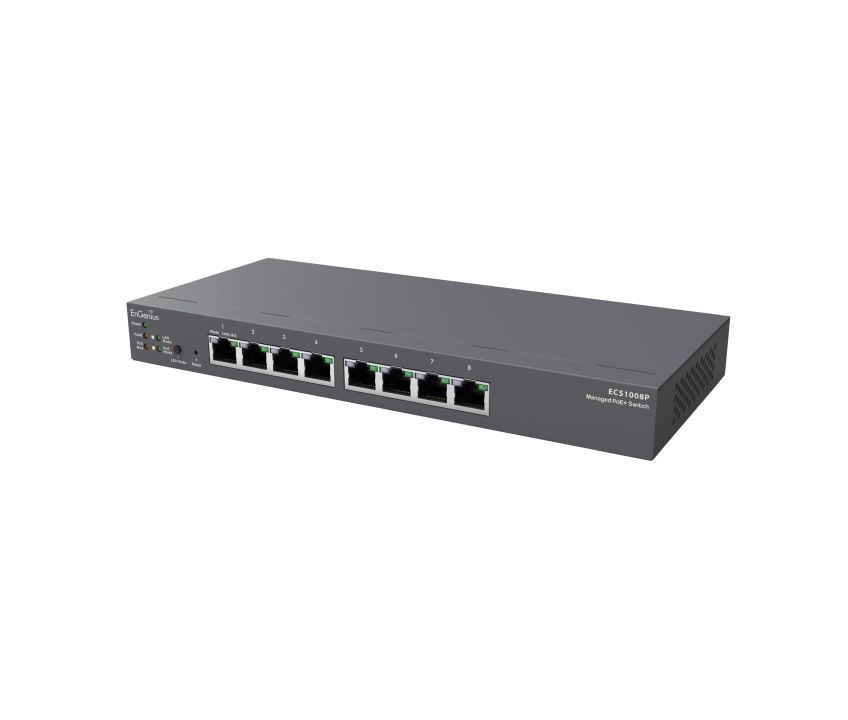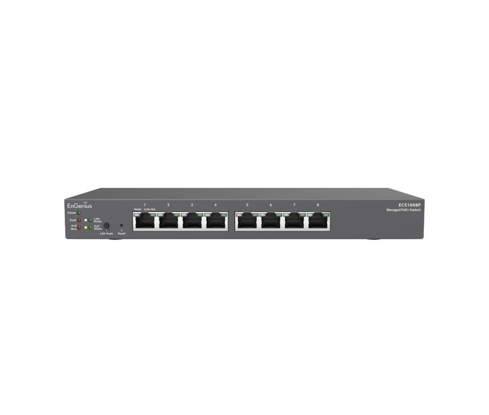 EnGenius Switch fully managed Layer2+ 8 Port? 8x 1GbE? PoE budget 55W? 8x PoE af? Desktop Switch? Fanless? ECS1008P? EnGenius Cloud