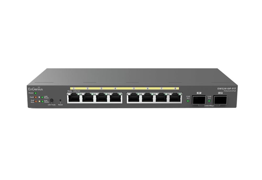 EnGenius Switch fully managed Layer 2+ 10 Port? 8x 1GbE? PoE budget 55W? 8x PoE at ? 2x SFP? Desktop switch? Fanless? EWS2910P-FIT? FitCon/F
