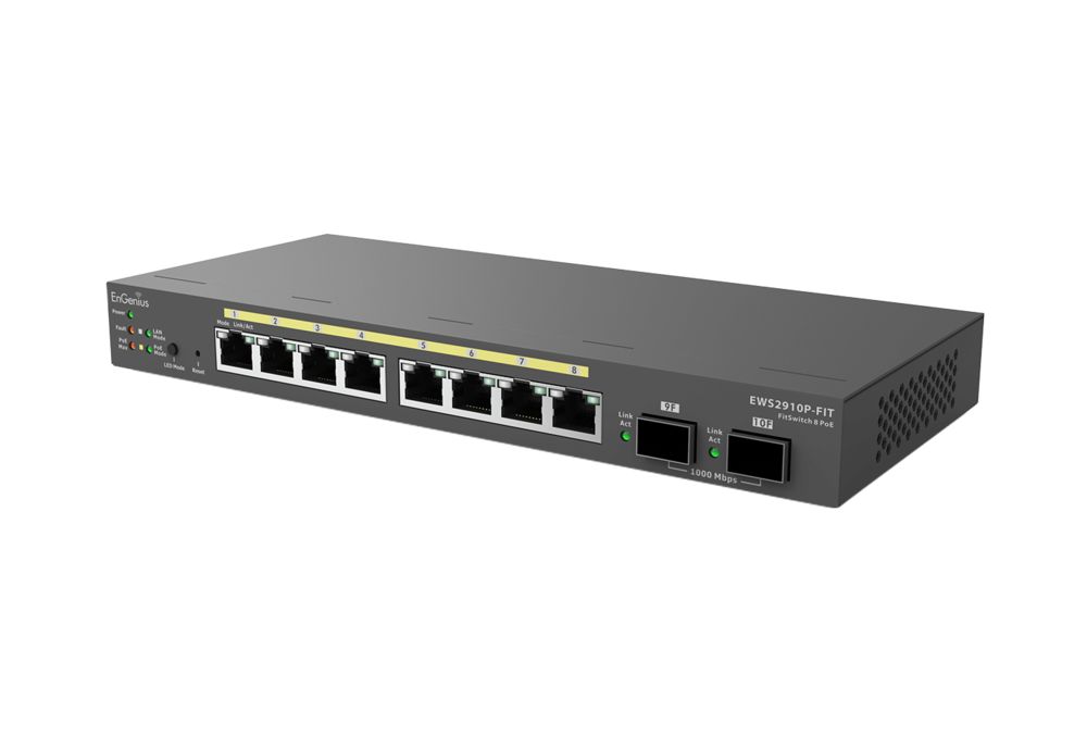 The article EnGenius Switch fully managed Layer 2+ 10 Port? 8x 1GbE? PoE budget 55W? 8x PoE at ? 2x SFP? Desktop switch? Fanless? EWS2910P-FIT? FitCon/F is currently in stock