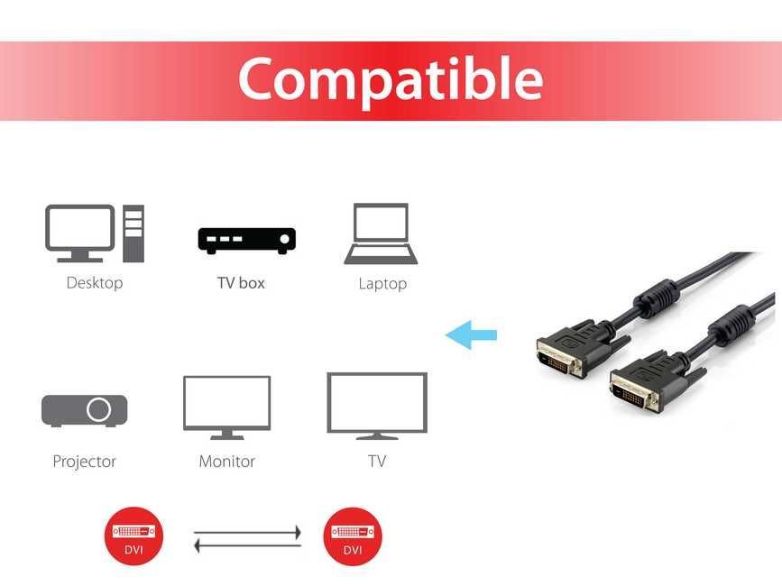 We offer you Equip DVI cable DVI (24 +1) -> DVI (24 +1) M / M 5.00m black always at the best possible price. We can give you a discount of 2% on Equip DVI cable DVI (24 +1) -> DVI (24 +1) M / M 5.00m black if you choose payment in advance on ordering.