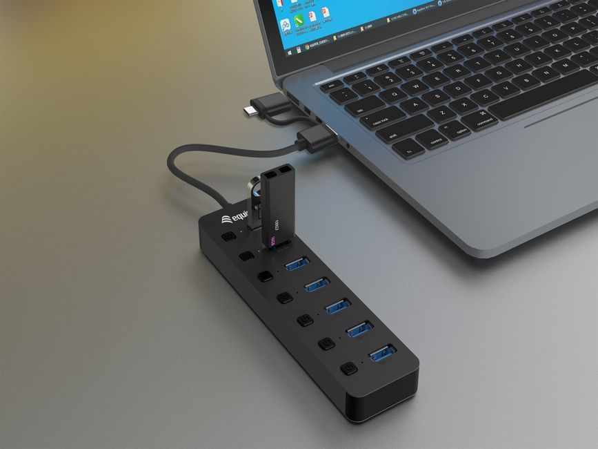 The article Equip USB hub 7-port 3.2 -> 7x3.2 5Gbps with power supply black is currently in stock