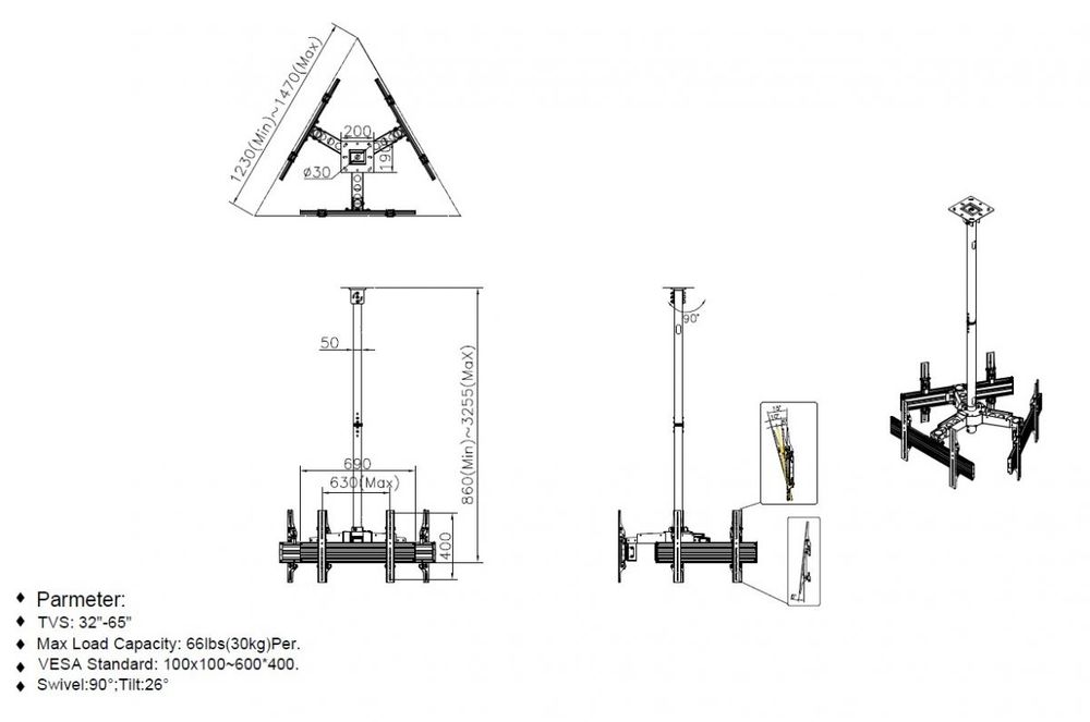 Equip ceiling mount 81,3 cm ( 32 inch )-165,1 cm ( 65 inch )/3TFT 30kg each 2 joints tilt. sw