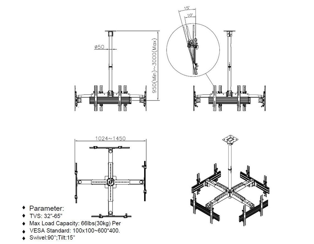 Equip ceiling mount 81,3 cm ( 32 inch )-165,1 cm ( 65 inch )/4TFT 30kg each 2 joints tilt. sw