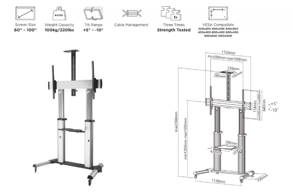 Equip floor stand 152,4 cm ( 60 inch )-254 cm ( 100 inch )/1TFT 100kg 2 shelves height sw
