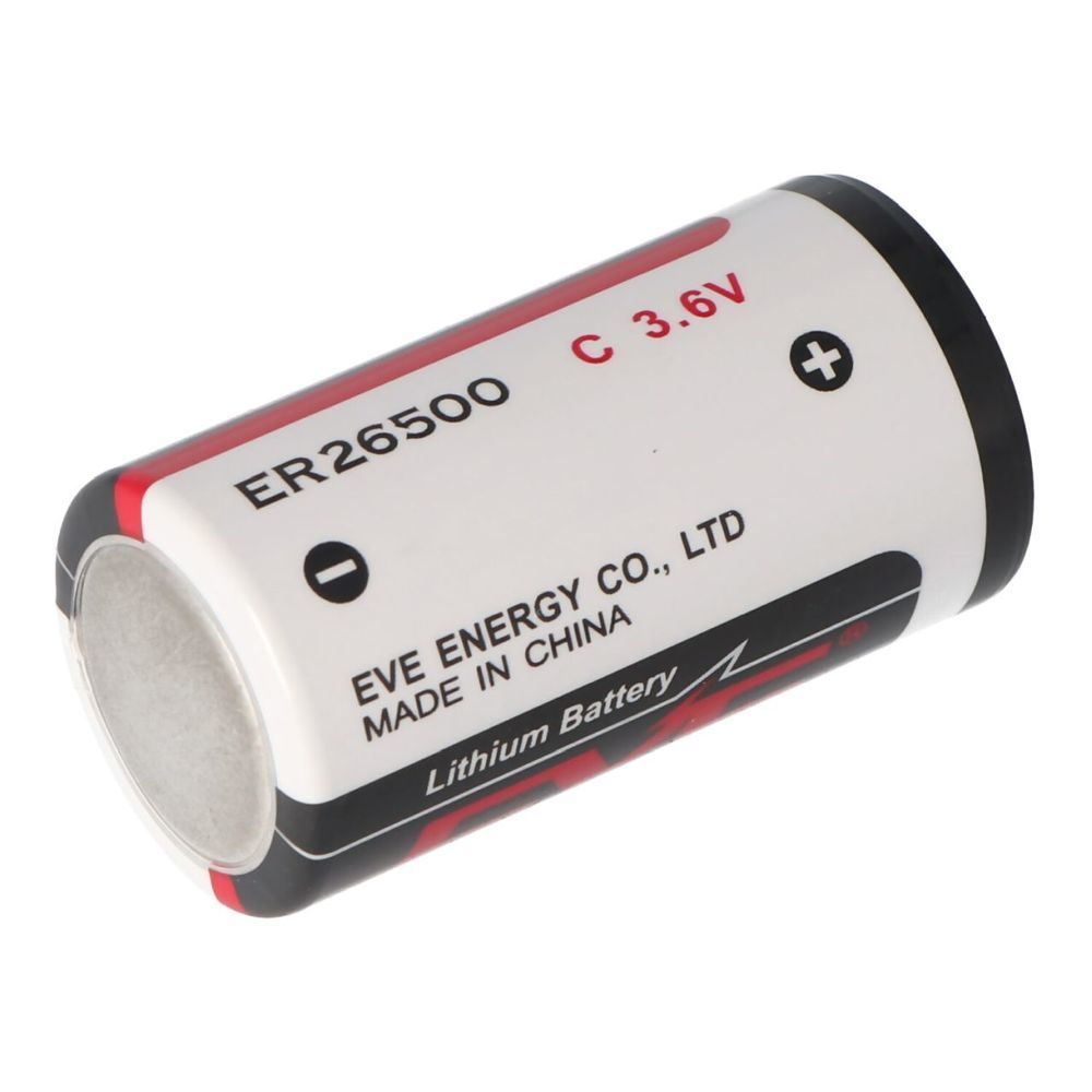The new Lithium ER26500 C- Size standard battery with 3.6 volts and up to 8500mAh capacity. It has a length of 50mm and a diameter of 26.5mm and weighs just 55grams. Can be stored for up to 10 years, disposable lithium battery, not rechargeable. Standard discharge current 2.0mA, max. recommended discharge current 200mA. Also suitable as a replacement battery ER26500, E EMB ER26500 e.g. for gate drives, eemb ER26500 The ER26500 is characterized by a high operating voltage and ensures the greatest possible stability. It also impresses with its wide temperature range from -55 degrees °C to +85 degrees °C. Thanks to all the features, the ER26500 is predicted to have a long service life and high reliability; under optimal conditions, it can provide up to 10 years of performance. Very low self-discharge rate of approx. 1%. Its internal bobbin structure makes it ideal for almost all applications with low or very low discharge currents such as remote controls, CMOS memory backup, measuring devices, PC real-time clocks, medical devices, gas measuring devices, alarm sensors and other electronic devices with low up to very low loads.Technical data Model: ER26500 (C Size) IEC ER26500 Lithium:System Lithium Thionyl Chloride Battery Disposable Bobbin Design, voltage 3.6 volts