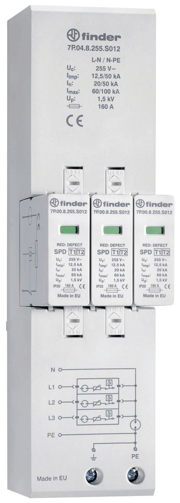 We offer you Finder 7P.04.8.255.S012 combination arrester type 1+2 for three-phase TN-S and TT networks always at the best possible price. We can give you a discount of 2% on Finder 7P.04.8.255.S012 combination arrester type 1+2 for three-phase TN-S and TT networks if you choose payment in advance on ordering.
