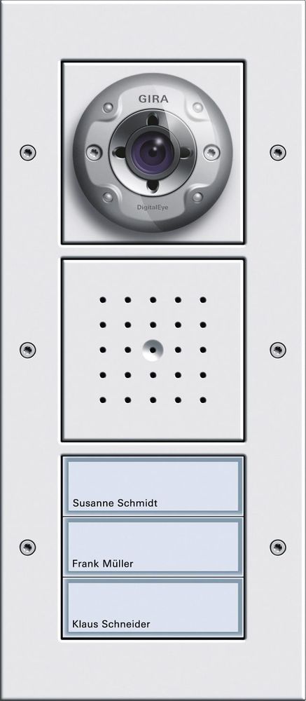 Tuerstation AP 3x video door communication system Tuerstation pure white with color camera, Tuerlautsprecher and call button 3 times as a completely assembled unit for the vertical surface mounting. Unneeded call buttons can be customized with the call buttons cover 1255 .. cover. The video Tuerstation AP has the following product features: - Completely pre-assembled wall Tuerstation in TX_44 design allows quick and clean installation. - Signaluebertragung and supply of the participants about the reverse polarity protected and short-circuit-proof 2-wire bus. - Rigid Aufputzgehaeuse by aluminum profile. - Cover made of shatterproof thermoplastic with high UV stability and a scratch-resistant, easy-care surface included. - Theft protection with Torx screws. - A one-man operation with easy startup procedure. - Weather-proof speakers. - High-quality electret microphone. - Speakerphone (voice controlled talk-back with echo and background Geraeuschunterdrueckung). - Acoustic acknowledgment signal at Ruftastenbetaetigung. - Sprachlautstaerke adjustable. - White call button illumination in LED technology. - Splash-proof call button cover made of impact resistant plastic. - Name plate of the call button without tools and without frame removal. - Professional lettering over the Gira inscription service www.beschriftung.gira.de or the Gira inscription software. The color camera has the following features: - Automatic Camera Night Switch: The camera switches from a defined ambient brightness of day mode (color display) to night mode (black and white representation) and vice versa. Due to the high sensitivity at night mode, good presentation results are achieved even in poor light conditions. - LEDs provide in night mode for a gleichmaessige field illumination at close range. - Camera horizontally and vertically by 20 retractable system. In combination with the wide angle lens, this results in a very large viewing angle. - Automatic backlight compensation. - Automatic White Balance. - Automatic Verstaerkungsregelung (AGC). - Built-in camera with heater temperature detection. - Splash-proof cover. - Camera cover made of impact resistant plastic, at any scratching, eg vandalism, easily replaceable.Power supply: 26 V DC 2 V (bus) connections: 2 screw terminals for 2-wire bus connections: 2 screw terminals for additional supply Dimensions: W x H x D 110 x 253 x 19 mm (without camera) Dimensions: W x H x D 110 x 253 x 40 mm (with camera) Dimension Tagged: W x H 62 x 18 mm Image Sensor: CCD sensor 0.85 cm (1/3) Wide-angle lens: 150 opening angle Visible detection range: angle of the camera 100 Detectable range (at 20 tilt) : 140 Color System: PAL Picture Elements: 500 (H) x 582 (V) Horizontal Resolution: 380 TV lines Switching threshold color to SW: 1
