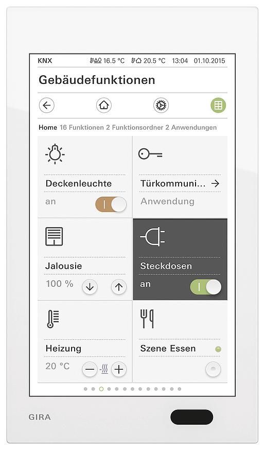 Gira G1 230 VGlas WhiteThe Gira G1 is a multifunctional room control device for visualizing and operating a wide range of building functions. For use in the KNX system and in the Gira door communication system or as a client. The respective range of functions depends on the firmware used.For the exact range of functions, please refer to the Gira online catalog and the technical device documentation.Features: Operation is via a gesture-capable multi-touch display. Connection and communication depends on the variant via LAN or WLAN. Integrated loudspeaker. Integrated microphone with echo compensation. Possible uses and combinations: The Gira G1 as a multifunctional room control device provides the following functions or combinations of functions: KNX room control device Home station Video client for the following systems Server - HomeServer ? eNet ? X1 security system Alarm Connect Integration of Internet servicesProperties as a KNX room control device: Intuitive user interface that can be customized by the end user. Switching, pressing, dimming (relative and absolute), dimming (including dimming RGB, RGBW and tunable white), blind and roller shutter control, value transmitter, scene extension. Status display, display of date and time, display of indoor and outdoor temperature. Up to 150 functions (six function folders or rooms with up to 25 functions each). Up to 125 weekly timers with 10 switching times each. Room temperature controller in combination with the optionally available temperature sensor module or KNX devices for room temperature measurement, e.g. touch sensor 3 comfort. Operating modes: comfort, standby, night and frost or heat protection, each with its own temperature setpoints (for heating and/or cooling). Operating modes can be individually adapted. A heating clock as a weekly timer with 28 switching times. Room temperature controller extension for controlling air conditioning systems (fan coil) in conjunction with a KNX gateway for air conditioning systems. Supports KNX Data Secure and KNX IP Secure.Properties as a home station video: Camera switching: targeted selection of the connected color cameras. Control of the door opener. Switching the ringtone on and off. Ringtone can be selected from 10 melodies.Properties as a home station with SIP client: Client function for third-party SIP systems from e.g. Comelit, TCS, SCHÜCO DCS Touch, 2N. SIP direct calls or via registrar possible 64 internal calls possible e.g. to the concierge Early Media support for video imagesIntegration of Internet services: Gira weather portal: Display of the weather forecast for up to five locations (Internet connection required).The Gira G1 can also be used as a client for the following systems Server: HomeServer client eNet client X1 client Alarm Connect security system When functioning as a client, the functions of the KNX room control unit are not available. For the exact range of functions, please refer to the Gira online catalog and the technical device documentation.Gira G1 with flush-mounted connection module 230 V WLAN. Data communication via WLAN. Notes: Only suitable for indoor use. Recommended installation height: 150 cm from the floor. Installation takes place on a deep device box (electronics box recommended for LAN connection). Communication with the KNX installation takes place exclusively via the KNXnet IP standard. A KNX IP router must be used to connect the Gira G1 PoE to the KNX installation. Several Gira G1s can be operated on a KNX IP router. To connect the Gira G1 230 V or G1 24 V to the KNX installation, a Gira KNX IP router (from firmware version 3) is required to ensure reliable communication in the WLAN. For this purpose, the Gira KNX IP router (from firmware version 3) is specially equipped with the additional function 'Reliable data communication'. Several Gira G1s can be operated on a Gira KNX IP router (from firmware version 3). Commissioning in the KNX system from ETS 5.5 or higher.
