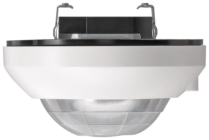 Presence detector comfort for KNX pure white presence detector for presence monitoring (operating mode: presence detector), for motion detection (operating mode: ceiling monitor) or for monitoring by message telegrams (operating mode: detector) indoors. Features: Flush-mounted device with integrated KNX bus connection. Programming LED button can be operated visibly after removing the decorative ring when installed. PIR sensors: three sensors (crossed beam paths), integrated brightness sensor. Adjuster for manual correction of sensitivity. Sensitivity configurable. Sensitivity adjuster on the device can be deactivated via software. Display of motion detection (permanent or only in the walking test). Separate evaluation in the long-range of the three PIR sensors, each with 120 detection field with overlap. Manual operation via IR remote control. A maximum of 5+2 function blocks can be configured. Function blocks 1 to 5 each have an adjustable function: ceiling monitor, presence detector, message operation. Function block 6: presence detector with light control. Function block 7: Brightness sensor with limit value monitoring. Function block switching, e.g. for daytime or nighttime operation or weekday or weekend operation. Function blocks 1 to 5: Single device, main unit, extension unit adjustable. Adjustable operating mode with single device as main unit: Automatic, semi-automatic (Manual ON Automatic OFF or Automatic ON Manual OFF). Two outputs per function block (1 to 5) for ceiling monitor, presence detector function. Ceiling monitor, presence detector functions per output: Switching, staircase function, switching with forced position, dimming value transmitter, light scene extension unit, temperature value transmitter, brightness value transmitter, temperature operating mode. Ceiling monitor, presence detector: Adjustable twilight level, twilight level via external communication object or via teach-in, additional transmission delay via external communication object, adaptive follow-up time (self-learning additional transmission delay), short-term presence function, feedback of the twilight level, lock function, manual operation via touch sensor (separate communication object), switch-off brightness (with presence detector) via teach-in, measurement of the time period after the last movement. Presence detector function with light control: Combination with presence detector function block or individual device, setpoint adjustable, setpoint specification via external communication object, setpoint shift via external communication object, teach-in function, feedback of the effective setpoint. Brightness sensor function with limit value monitoring: Up to three limit values can be configured, switching functions, dimming value transmitter, light scene extension, hysteresis can be configured, limit value via external communication object or teach-in, lock function. Notes: The presence detector is not suitable for alarm messages in VdS-compliant alarm systems. Ceiling mounting on solid ceilings in device boxes or surface-mounted housings.