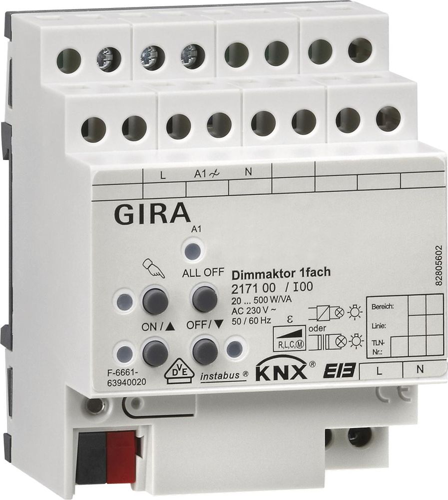 Dimming actuator 1-way for KNX 20 - 500 W VA REG plus Features: Dimming actuator with integrated bus connection. Switching and dimming of incandescent lamps, HV halogen lamps, dimmable HV LED lamps, dimmable compact fluorescent lamps, dimmable inductive transformers with LV halogen or LV LED lamps, dimmable electronic transformers with LV halogen or LV LED lamps. Automatic or manual selection of the dimming principle that suits the load. Idle, short-circuit and overtemperature proof. Manual operation of the outputs independent of the bus (construction site operation also possible). The 1-way dimming actuator can also be used as a speed controller to control the speed of single-phase electric motors. Construction site operation: Outputs can be operated manually without bus voltage, only with the operating voltage. Functions: Independent control of the dimming channels. In construction site operation, the outputs can be operated manually, without bus voltage, only with the operating voltage. Central switching function for controlling all dimming channels. Delay for actively sending feedback after bus voltage returns. Specification of the load type and determination of the dimming principle possible: Universal (with automatic calibration process), electronic transformer NV-LED (capacitive phase cut-off), conventional transformer NV-LED (inductive phase cut-off), HV-LED (phase cut-off) or HV-LED (phase cut-off). Feedback 'switching' and 'brightness value'. Setting of the dimmable brightness range possible. Dimming behavior and dimming characteristics can be parameterized. Switch-on behavior with relative dimming command can be parameterized. Lamp-friendly switching on and off. Automatic setting and scaling of the dimmable brightness range when using universal power boosters. The behavior of a dimming channel in the 'OFF' state when receiving a relative dimming command can be parameterized (switch on and dim up or no reaction). Reporting telegrams for short circuits, overloads and load failure. Feedback of the connected load type. Locking function or forced position function can be parameterized for each output. Time functions (switch-on or switch-off delay, staircase lighting function). Staircase lighting function with advance warning function through time-controlled reduction of the lighting or activation of permanent lighting. Linking function and up to eight scenes per dimming channel possible. Operating hours counter for recording the switch-on time. Reactions in the event of bus voltage failure and return can be set. Notes: Power extension using Gira power boosters. Installation on DIN top hat rail. VDE approval in accordance with EN 60669-1, EN 60669-2-1.