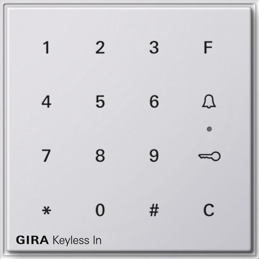 (IP 44) pure white keypad as an access control system based on a capacitively acting and therefore wear-free keypad. The keypad has the following product features: - installation in the 58 mm flush-mounted box. - Capacitive keyboard. To enter the code a slight rapprochement or contact the number is sufficient. Due to the wear-capacitive technology no discernible wear frequently benuzter digit combination. - Allows a stand-alone device or in combination with the Gira door communication system, enables convenient Tueroeffnung for authorized persons and a Tuerrufsystem for buildings with more units. - In stand-alone mode, in the flush-use potential-free relay contacts are used for the switching operations, eg for door with its own power supply (eg handelsueblicher bell transformer). - Special C" key: delete a wrong entry. - Special key "keys": When the correct code is filed with Tastenbetaetigung a direct Tueroeffnung. - Special key "bell": Specific selection of home stations in large objects. - Special "F key: In conjunction with switching actuators 1211 00, 1289 00 of the Gira door communication system are hereby switching functions possible. - Integration in the Gira door communication system without other system components. - Start with direct configuration at the device, possible - the keypad is taken without a PC or programming software in operation. - Homogeneous blue LED illumination of the numerals and special characters at night. - Design diversity through integration into the Gira design platforms TX_44, System 55 Integration into Flaechenschalter and stainless steel 20 series, 21 series over adapter frame possible. - Master PIN number on the enclosed sealed security card is lost, the administrator PIN number. - The keypad can manage up to 255 codes. - Up to 32stellige codes possible. - Acoustic at Tastenbetaetigung FEEDBACK. - Three-color LED status indicator for visual signaling during programming and during the operation. - Beep on unauthorized removal of keyboard attachment for tamper detection. In combination with the Gira door communication system is also a means of tamper circuit switching is possible to realize. - The two built-in switching relay can be assigned to two different codes, eg Code 1: Tueroeffnung, Code 2: Turn of the Aussenlichtes.Ein and outputs - Switching contact: 2 relays with potential-free change-over contacts - Load capacity 24 V / 1.6 A AC / DC - Plug connector system Gira door communication system - 2 ports Auxiliary supply protection: