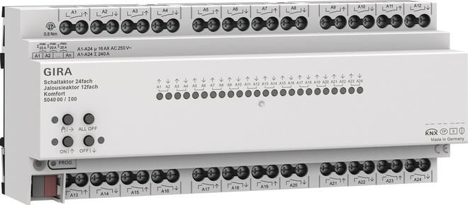 KNX switching actuator 24-way 16 A Blind actuator 12-way 16 A KomfortREG plusDepending on the parameterization, the actuator can be used as a switching actuator or as a blind actuator. Mixed forms of switching and blind actuator are also possible. For the blind actuator function, two adjacent relay outputs are combined to form a blind output.Features: Blind or switching operation can be parameterized. In blind mode, the adjacent outputs (A1 A2, A3 A4...) are combined to form a blind output. Mixed operation on one actuator (e.g. A1 & A2 blind, A3 & A4 blind, A5 switching, A6 switching...) possible. Up to 8 independent logic functions for implementing simple or complex logical operations. Actively sending feedback or status messages can be globally delayed after bus voltage returns or after an ETS programming operation. Manual operation of the outputs independent of the KNX with intelligent LED status displays to save energy. Bistable relays. Supply from the KNX bus, no additional power supply required. Simplified terminal connection (no terminal overlay). Blind functions: Operating mode can be parameterized: Control of slatted blinds, roller shutters, awnings, skylights or ventilation flaps. Separately parameterizable curtain travel times with travel time extension for travel to the upper end position. For slatted blinds, a slat travel time can be parameterized independently. Switchover time when changing direction and times for short and long-term operation (step, move) can be set. Reaction when bus voltage returns and after an ETS programming process can be set for each output. Central control of all blind outputs possible via up to 6 long-term objects (UP, DOWN, permanently UP, permanently DOWN). Feedback of the curtain position or the slat position. In addition, an invalid curtain position or a drive movement can be reported back. Active (sent to the bus when there is a change or cyclically) or passive (object can be read out) feedback functions. Assignments to up to 5 different safety functions (3 wind alarms, 1 rain alarm, 1 frost alarm), optionally with cyclical monitoring. The safety functions (objects, cycle times, priority) are created together for all outputs on a device-oriented basis. Individual outputs can be assigned to the safety functions and the safety reactions on a channel-oriented basis. A comprehensive sun protection function with fixed and variable blind or slat positions can be activated separately for each output at the beginning or end of the function. Including dynamic slat offset for slatted blinds. Also with extended sun protection for integration into more complex shading controls (has separate automatic and blocking objects). Also optionally with automatic heating, cooling and presence function. Fabric tightening function for awnings. Extended blocking function with acknowledgement option.Ventilation function for windows with window contacts. Intelligent teaching function for blind movement. Forced position function or blocking function can be implemented for each blind output. Up to 64 internal scenes can be parameterized for each output. Scene storage function: Additional visual feedback. Extended scene recall (toggling of scenes). Switching functions: Independent switching of the switching outputs. Normally open or normally closed operation. Central switching function via up to 6 switching objects (ON, OFF, permanently ON, permanently OFF) and collective feedback. Switching feedback: Active or passive feedback function. Reaction to bus voltage failure or bus voltage return and adjustable for each output after an ETS programming process. Logical linking function individually for each output. Blocking function can be parameterized for each channel. Alternatively, forced position function separately for each output. Extended blocking function with acknowledgement option. Time functions (switch-on, switch-off delay, staircase light function - also with pre-warning radio