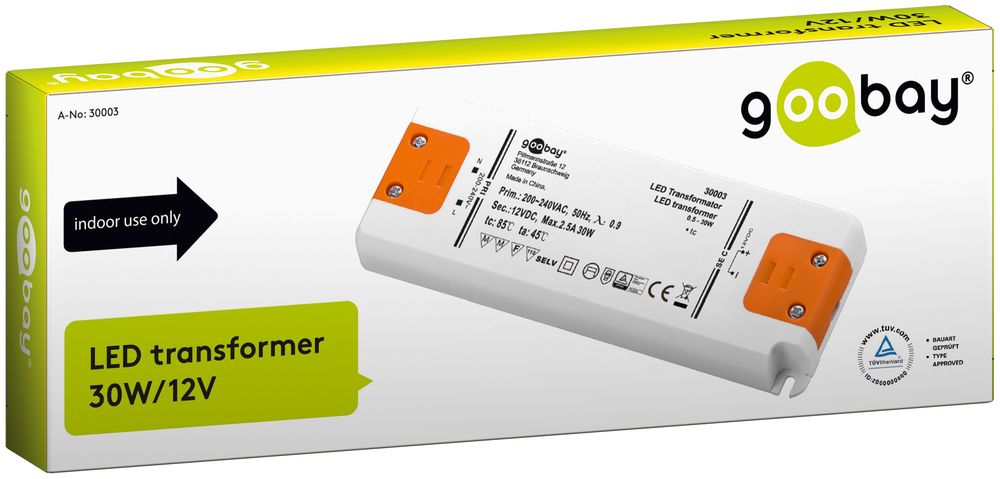 We offer you Goobay 30003 LED transformer 30W / 12V - 12V DC for LEDs to 30 watts total load always at the best possible price. We can give you a discount of 2% on Goobay 30003 LED transformer 30W / 12V - 12V DC for LEDs to 30 watts total load if you choose payment in advance on ordering.