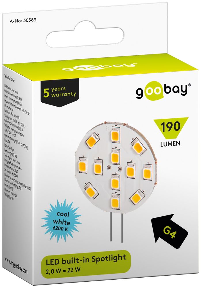 The article Goobay 30589 LED recessed downlight, 2 W - Base G4, replacing 22 W is currently in stock