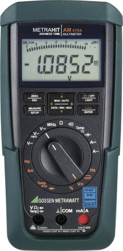 TRMS system multimeter with 12,000 digits digital display, data logger and IR interface. The METRAHIT AM XTRA is the top device in the METRAHIT Advanced Multimeter series. The multimeters in the METRAHIT AM series: METRAHIT AM BASE, PRO, TECH and XTRA are absolutely robust and reliable digital multimeters with housings made of impact-resistant plastic. The devices have an attractive design and feature the latest technology. The METRAHIT AM XTRA is the top device in the METRAHIT Advanced Multimeter series. Top technology down to the last detail: The robust digital multimeters in the METRAHIT AM series offer impressive performance features in every respect. They are equipped with the latest technology and guarantee highly precise results. Their ergonomic design ensures maximum user-friendliness and safety. With their wide range of functions, they are ideally suited to demanding measuring tasks in many areas. TRMSAC, AC+DC measurement up to 20 kHz for voltage and currentData logger and IR interface for PC power supply connection. Universally applicable in all areas of electrical engineering! True RMS measurement up to 20 kHz with 12000 digits digital display and analogue scale Measurement of voltage and current, DC, AC and ACDC, resistance, temperature, frequency, duty cycle, capacitance, continuity / diodes Clip function for current measurement with current sensors and converters Automatic measurement range selection and measured value storage Safety for the user and the device in the measurement categories CAT IV up to 600V and CAT III up to 1000V. . The multimeter is suitable for universal use in electrical engineering, in the areas of electrical installation, laboratory, telecommunications, training, etc. The device is suitable for field use and has an internal mains-independent power supply. The additional power supply connection is ideal for long-term measurements and laboratory use. Resolution ± 12000 digits, 4½ digits 3 sockets with automatic socket lock ABS (patented) TRMS AC and AC / DC function Voltage measurement with a basic accuracy of ± 0.05% (VDC) Automatic and manual measurement range selection Automatic measurement value storage DATA / MIN / MAX Large, light blue illuminated display with extra large digits (15mm) and analog bar graph for dynamic processes Separate battery and fuse compartment Dust and water protection according to protection class