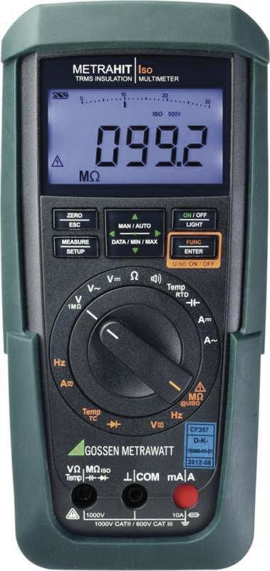 TRMS multimeter and insulation measuring device with 30,000 digits. The METRAHIT ISO is a digital multimeter with insulation measurement. It is robust and reliable for professional use and has an attractive design with housings made of impact-resistant plastic and is technically state-of-the-art. METRAHIT ISO is a portable and robust measuring device, especially for servicing household appliances in the 'white goods' category, electrical machines and vehicles, e.g. industrial trucks, and electrical systems, e.g. photovoltaic systems. It is suitable for field use and has an internal mains-independent power supply. TRMS multimeter with ± 30,000 digits resolution for voltage, current, temperature, etc. Insulation resistance measurement with 50 to 1000 V test voltage and external voltage detection Data logger for 15,400 measured values and IR interface to the PC. Safety-relevant tests for electrical devices and machines in a field-suitable device. Insulation resistance testing with test voltages up to 1000 V. Extensive multimeter functions for service and diagnosis, e.g. duty cycle measurement for setting up parallel-running motors. With its 30 multimeter functions and insulation resistance measurement, the METRAHIT ISO is recommended for mobile service on household appliances, electrical machines and vehicles, e.g. forklifts, and systems, e.g. photovoltaics. The device is suitable for field use and has an internal mains-independent power supply from 2 x 1.5V Mignon batteries. 30 multimeter functionsResolution ± 30,000 digits, 4 ¾ digitsBasic accuracy ±0.15% (VDC)Insulation resistance measurement up to 3.1 G¿ with external voltage detection and 50, 100, 250, 500, 1000 V test voltageVoltage ACTRMS, voltage AC+DC TRMS, voltage DC, level dB, relative value ¿REL, frequency, resistance, diode test, continuity test, capacity, current ACTRMS, current AC+DCTRMS, temperature with Pt 100/1000 sensors and K thermocouplesAdditional filter function and voltage measurement with reduced input resistance to limit interferenceAutorange current measurement from 100 nA to 10 A via a socket and a fuseClip function for the TRMS Current measurement with sensors and convertersAutomatic and manual measuring range selectionZero point setting ZEROAutomatic measured value storage DATA / MIN / MAXData storage for 15,400 measured values for long-term measurements as a data loggerInfrared interface for communication with the PCLarge, light blue illuminated display with extra large digits (15mm) and analogue bar graph for dynamic processesSeparate battery and fuse compartmentPower supply connection for battery-independent operationInternal mains-independent power supplyHousing in