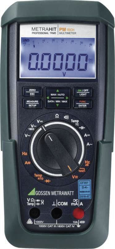 High-end TRMS system multimeter with 60,000 digits digital display, current measuring ranges optimized for measuring transducers and IR interface. The METRAHIT PM TECH is a universal multimeter from the METRAHIT Professional Multimeter series. The high-end TRMS multimeters from the METRAHIT PM series: METRAHIT PM TECH, XTRA and PRIME are absolutely robust and reliable digital multimeters developed for professional use. The devices have an attractive design with housings made of impact-resistant plastic and are technically state-of-the-art. The METRAHIT PM TECH is a universal multimeter from the METRAHIT Professional Multimeter series with current measuring ranges optimized for measurements on measuring transducers in the process industry. State-of-the-art quality measuring instruments with unique precision: 60,000 digits and 0.05% basic accuracy offer the highest level of result reliability. The latest technology ensures maximum safety. The variety of functions covers a wide spectrum of demanding measuring tasks. The innovative and ergonomic design inspires every day. TRMS AC, AC+DC measurement up to 20 kHz for voltage and current, direct current measurement with increased accuracy of 0.1% for measurements on 4-20 mA measuring transducers, wide-range capacitance measurement. Universally applicable in all areas of electrical engineering! True RMS measurement up to 20 kHz with 60,000 digits digital display and analog scaleMeasurement of voltage and current, DC, AC and AC+DC, dB, resistance, capacitance, temperature, frequency, continuity / diodesClip function for current measurement with converters and sensorsAutomatic measurement range selection and measured value storageSafety for the user and the device in the measurement categories CAT IV up to 600V and CAT III up to 1000V. The multimeter is suitable for universal use in electrical engineering, in the areas of electrical installation, laboratory, telecommunications, training, etc. Thanks to current measuring ranges with increased accuracy, it is particularly suitable for measurements on measuring transducers in the process industry.The device is suitable for field use and has an internal mains-independent power supply. DAkkS calibration certificate included36 month guarantee on material and manufacturing defects. 1 x multimeter1 pair of safety test leads (1.5 m) with 4 mm test probes, 1000 V CAT III, 600 V CAT IV (KS17-2)1 x hard case H
