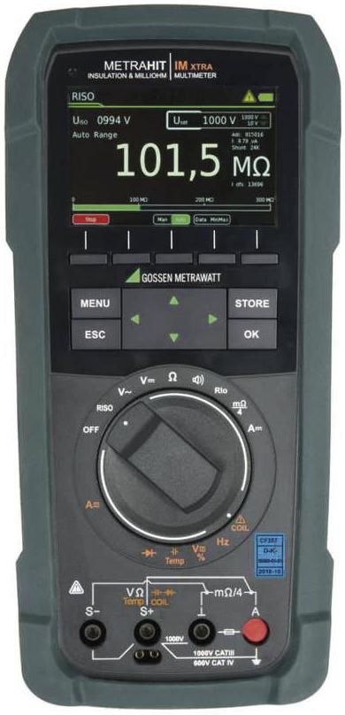All-in-one: multi- & milliohmmeter & insulation measuring device & winding test & data logger. The METRAHIT IM XTRA BT is a multi- & milliohmmeter and data logger. Applications can be found in industry in production and in the test field as well as in service in electrical engineering and in mechanical and vehicle construction. An all-in-one device with 30,000 digits: milliohm and multimeter, data logger and insulation resistance and winding tester. Compact and multifunctional for field use: Can be used just as advantageously in the aircraft cockpit as in other cramped measuring locations where otherwise several individual devices have to be used. Milliohm measurement with 4-wire connection (Kelvin measurement) with 200 mA or 1A Insulation tester with test voltages from 50 to 1000 V Short circuit test with 1000 V test voltage High-end TRMS multimeter with 100 kHz bandwidth. Safety-relevant tests for electrical devices, drives and installations with just one field-compatible deviceHigh-voltage system test according to UN ECE R100Insulation resistance measurement according to EN 61557-2 / VDE 0413-2Rlow installation test according to EN 61557-4 / VDE 0413-4Bonding test or potential equalization measurement, e.g. on the outer skin of the aircraft (lightning protection - discharge test/'wick test'). The multimeter is a portable, extremely robust multi-meter designed for field use. It is suitable for maintenance, service and diagnosis of electrical machines or drives and systems, e.g. in the automotive, avionics, energy or automation sectors.The all-in-one device is an insulation tester, milliohmmeter, short circuit tester and universal multimeter. It is ideal for safety testing and diagnostics on electric and hybrid vehicles as well as all types of electrical machines. In conjunction with an optional coil test adapter, it enables short circuit measurements. Insulation resistance measurement up to 3.1 GOhm with external voltage detection, test voltages: 50 V, 100 V, 250 V, 500 V, 1000 V according to EN 61557-2 DAR: Dielectric absorption rate and PI: Polarization index 4-wire milliohm measurement with Kelvin connection and 200 mA or 1 A measuring current for precise measurement of the smallest resistances with 1 microOhm resolution 2-wire Rlo measurement with 200 mA test current according to EN 61557-4 Short circuit test with 1000 V test voltage and optional COIL adapter Multifunctional device True RMS measurement TRMSAC/AC+DC for current/voltage up to 10/100 kHz Low pass filter AC, AC+DC Direct current measurement Current measurement with clamp sensors: The transmission factor can be set from 1:1 to 1:1000 with CLIP and is taken into account in the ampere display. Capacity measurement Precision temperature measurement °C, °F for RTD and TC-K sensors Diode measurement (K flow up to 5.1 V) and continuity test Acoustic signaling Recording of min/max values, DATA Hold Data logger thanks to integrated memory and real-time clock,also for individual measured values The push/print function transfers measured values to the application software at the touch of a button Programmable sequences for test routines METRALOG APP for Android OS Color graphic display Modular power supply: Standard lithium quick-change battery, optional power module with USB interface, change without interrupting the measuring circuit thanks to the patented touch-protected module socket Automatic socket lock (ABS) for the power input Test probe with function keys START (ISO) and STORE Housing