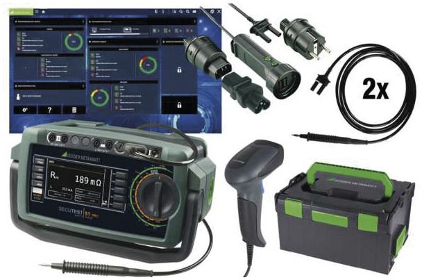 Standard test equipment set for testing the electrical safety of devices, particularly to comply with DGUV Regulation 3 and MPBetreibV including IZYTRONIQ data processing software. Test equipment set with SECUTEST ST PRO for testing electrical devices, medical devices and welding devices - with both predefined and optionally programmable test sequences that are necessary in accordance with the latest test standards DIN EN 50678 (VDE 0701), DIN EN 50699 (VDE 0702), IEC/EN 62353 (VDE 0751) and IEC/EN 60974-4 (VDE 0544-4). The set is particularly suitable for testing tasks within the framework of DGUV Regulation 3 and MPBetreibV, which enable professional recording of the test objects and documentation of the test. Report creation in HTML on USB memory. User guidance through pre-programmed test sequences according to standards with automatic evaluation - therefore ideally suited for use by trained persons. Fast access to the measuring and testing functions using rotary switches, direct selection keys and soft keys. The compact, shock-proof housing with integrated rubber protection makes it particularly suitable for mobile use, even on construction sites and in industrial environments. The unique multiple measurement enables convenient documentation of several measuring points. Also suitable for international use thanks to extensive setting options for language, keyboard, character set, date, time and country-specific standard versions. e.g. tests in industrial plants, public institutions, authorities, plants using power tools and/or three-phase devices, hospitals, universities, service providers for DGUV Regulation 3 and MPBetreibV, etc.. Protective conductor resistance measurement (passive, active, with 2 probes) 200mA and 10A insulation resistance measurement Leakage current measurements Replacement (alternative) method, direct method, differential method: protective conductor current, contact current device leakage current, patient leakage current, leakage current from the application part Voltage measurement: contact voltage, SELV, PELV voltage PRCD tripping time Function test (U,I,P,S,LF,f) Line test: continuity, short circuit, polarity (wire swap) Temperature measurement (for Pt100/Pt1000 sensor. Optional feature package DB-Comfort. 1 x SECUTEST ST PRO 1 x SORTIMO L-BOXX plastic system case 1 x foam insert 1 x EL1 adapter 1 x SK2 probe 2m 1 x Barcode reader with USB connection 1 x IZYTRONIQ BUSINESS Professional
