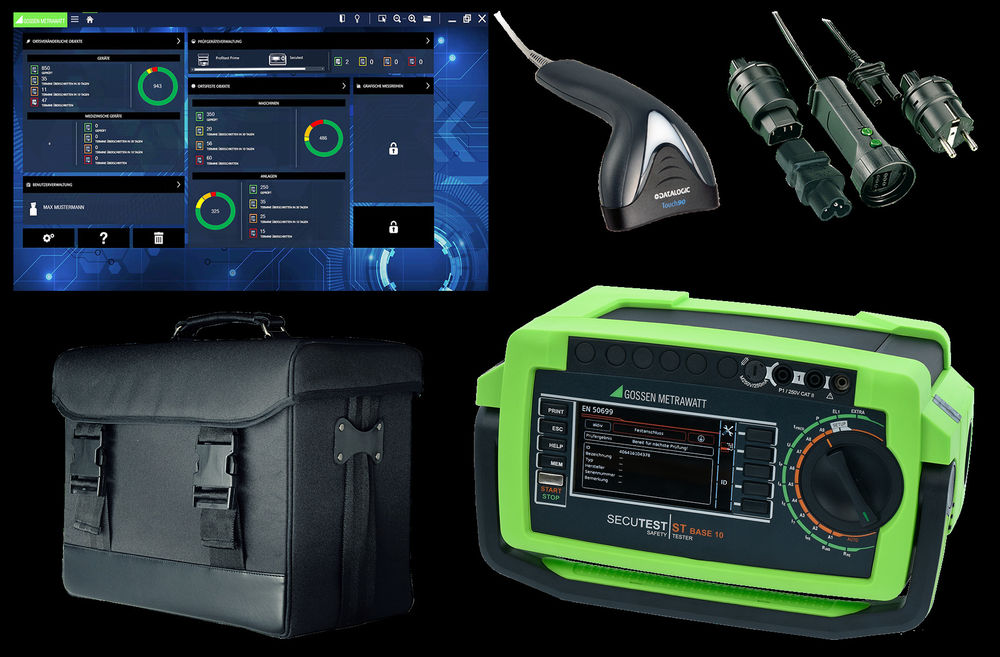 testing equipment set with SECUTEST ST BASE10 with DB+ and database comfort for testing electrical equipment, medical equipment and welding equipment - both with predefined and programmable test sequences that are necessary in accordance with the latest test standards DIN EN 50678 (VDE 0701), DIN EN 50699 (VDE 0702), IEC/EN 62353 (VDE 0751) and IEC/EN 60974-4 (VDE 0544-4).